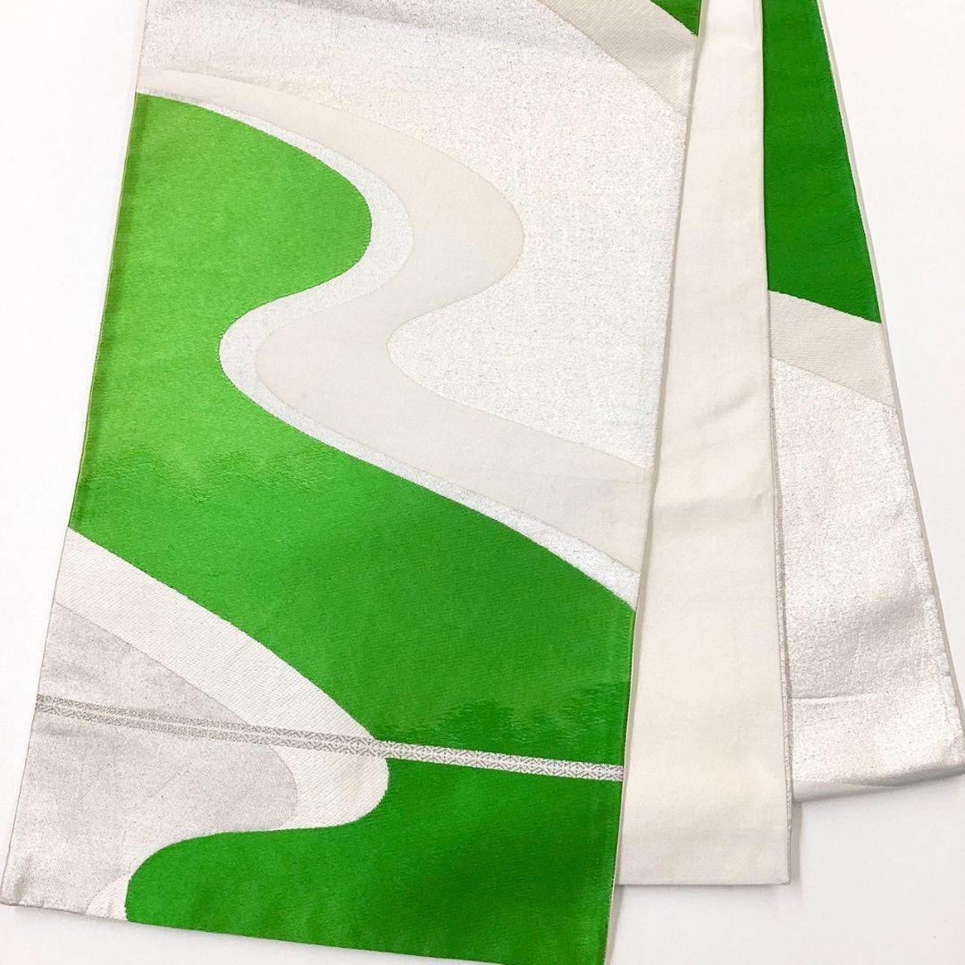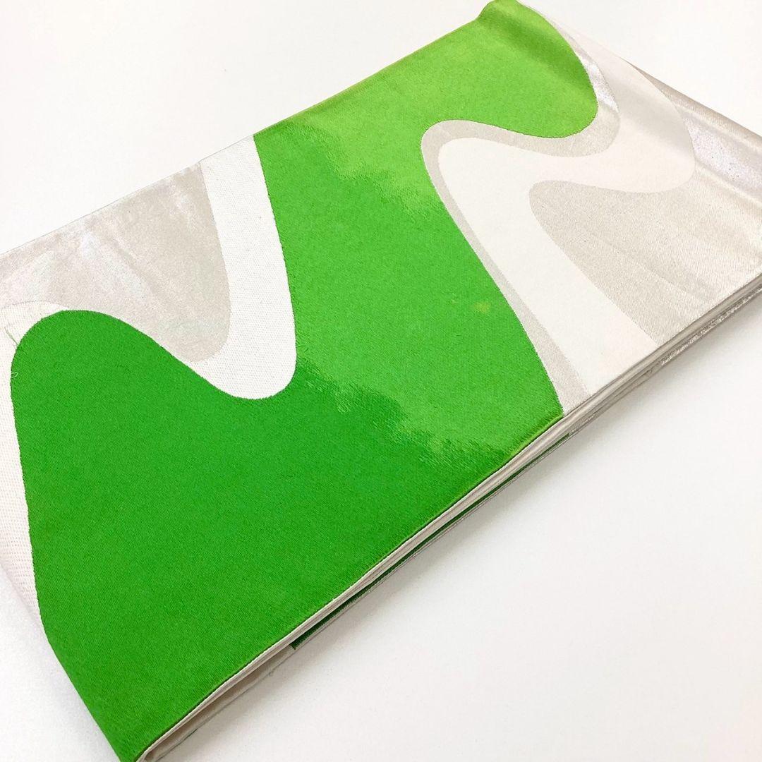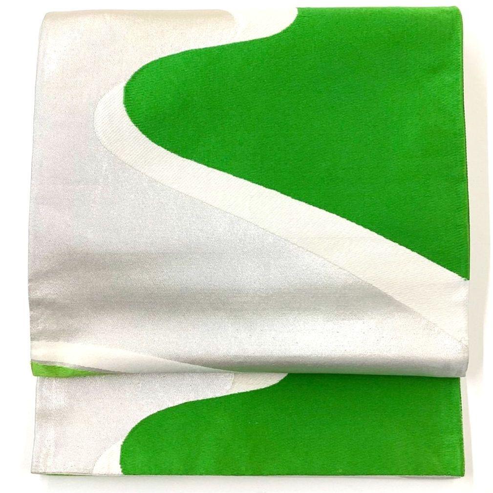 This is a pouch obi with a flowing water pattern and silver coloring.