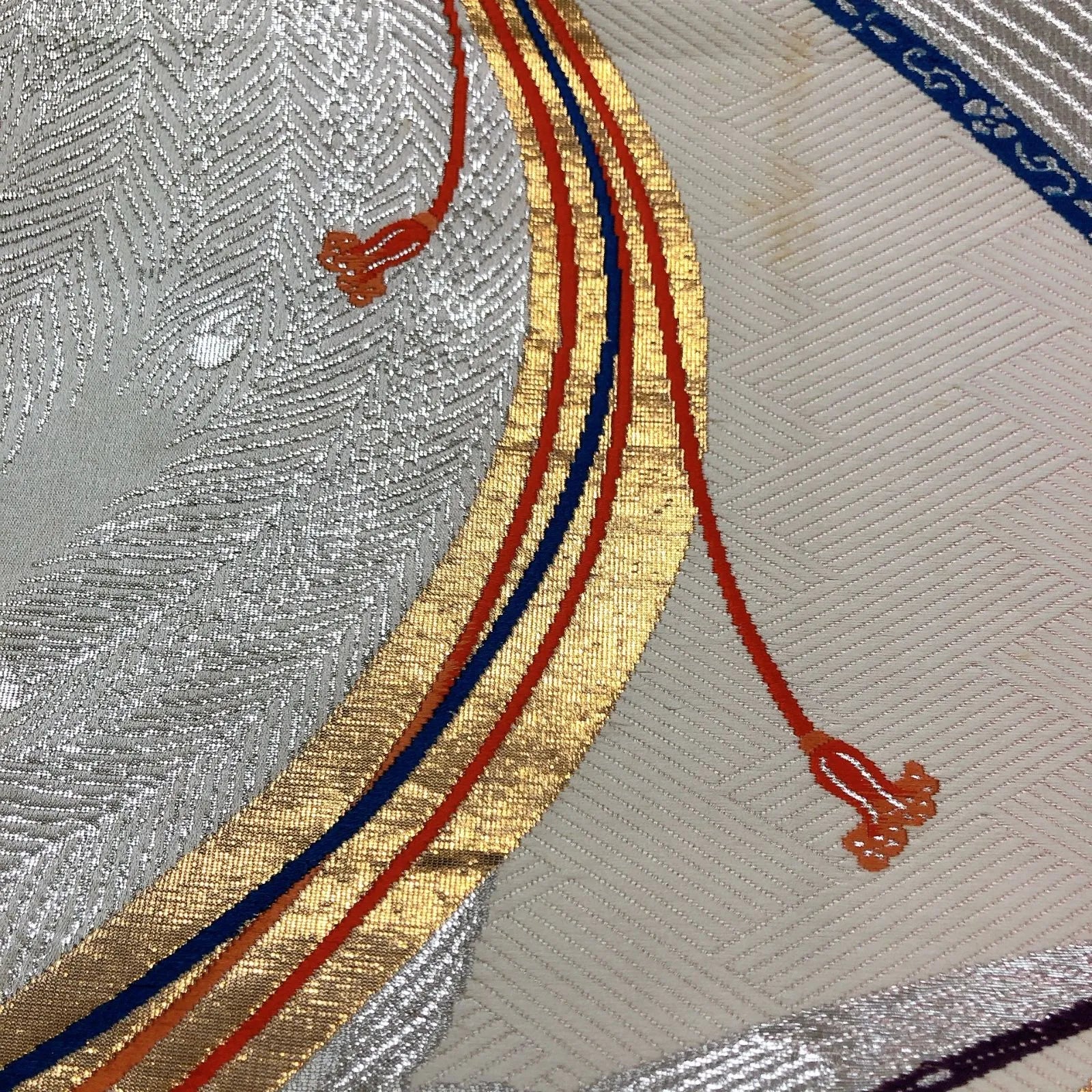 This is a pouch obi with a decorative cord design and silver coloring.