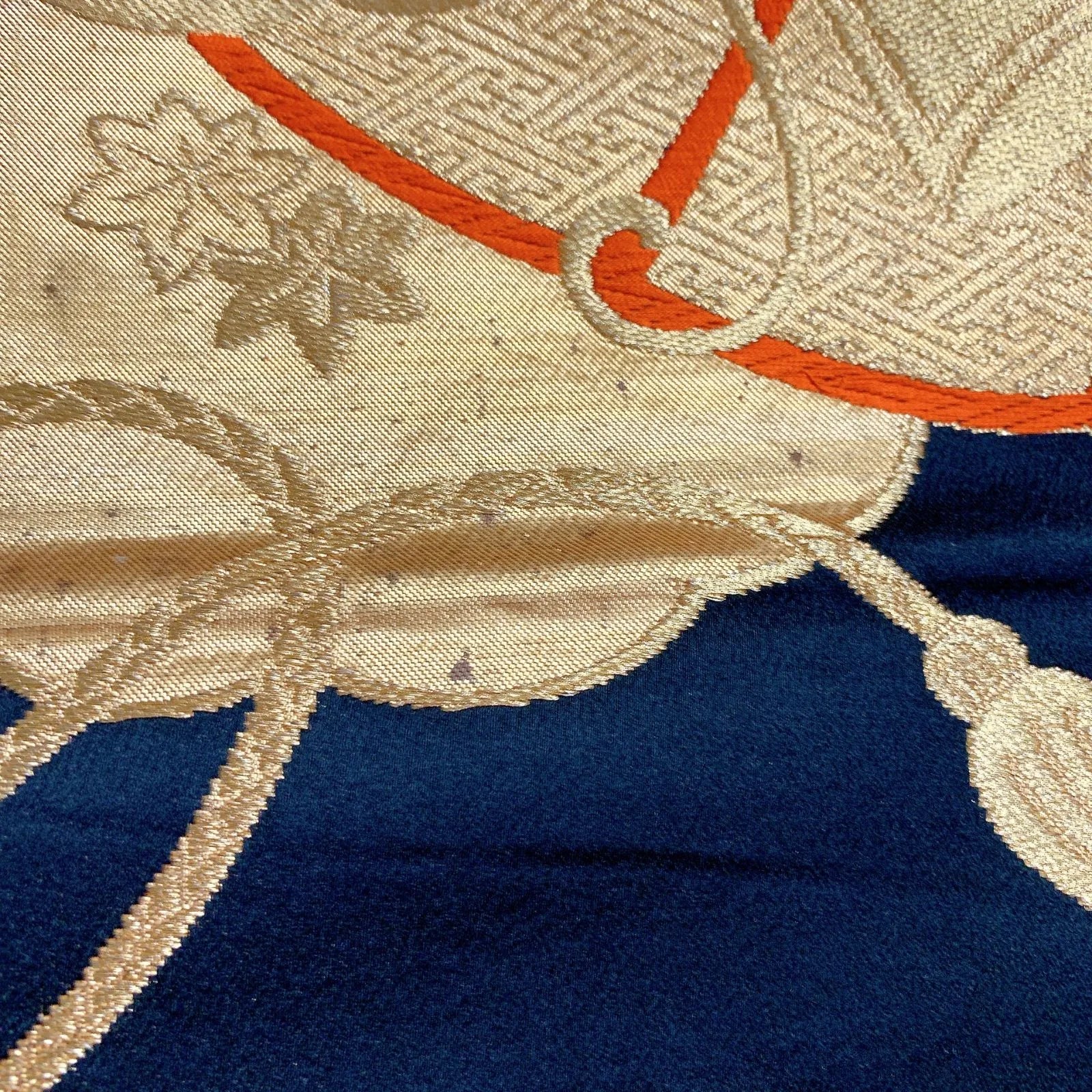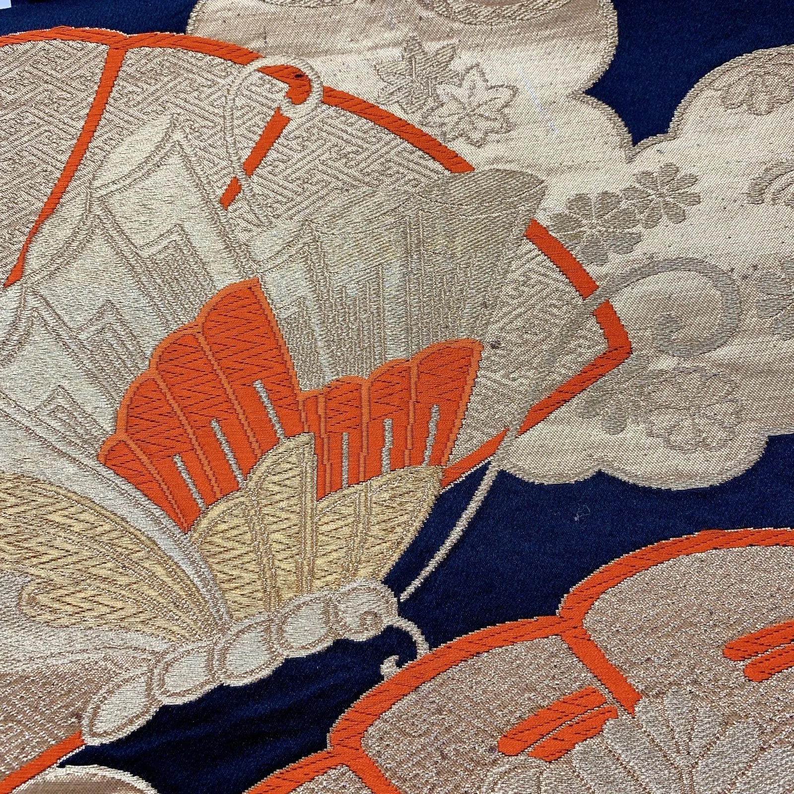 This is a pouch obi with a fan and butterfly design and gold thread.