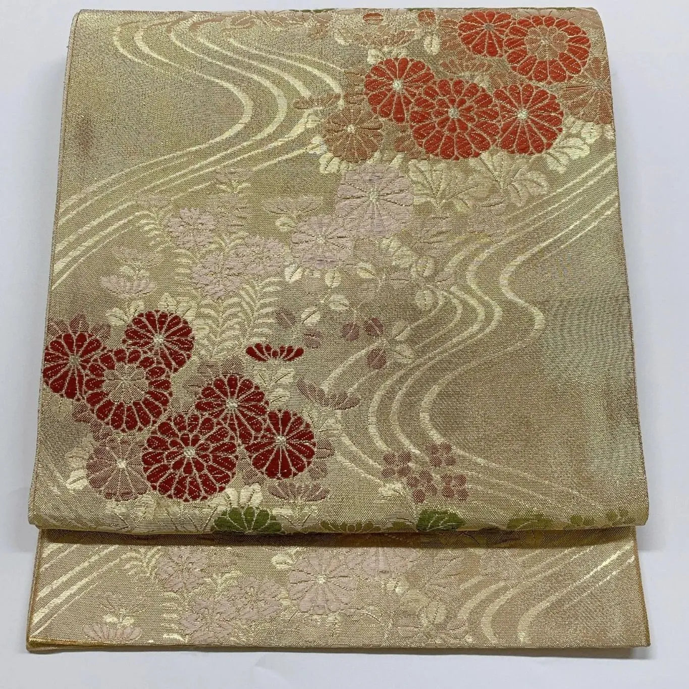 This is a pouch obi with a floral and running water design in gold.