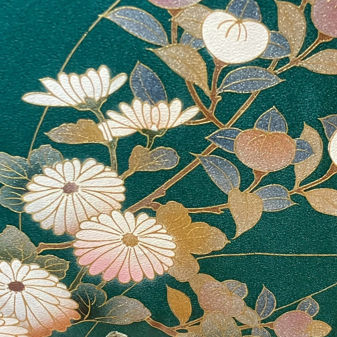 This is a visiting gown with a flowing water and flower design in gold.