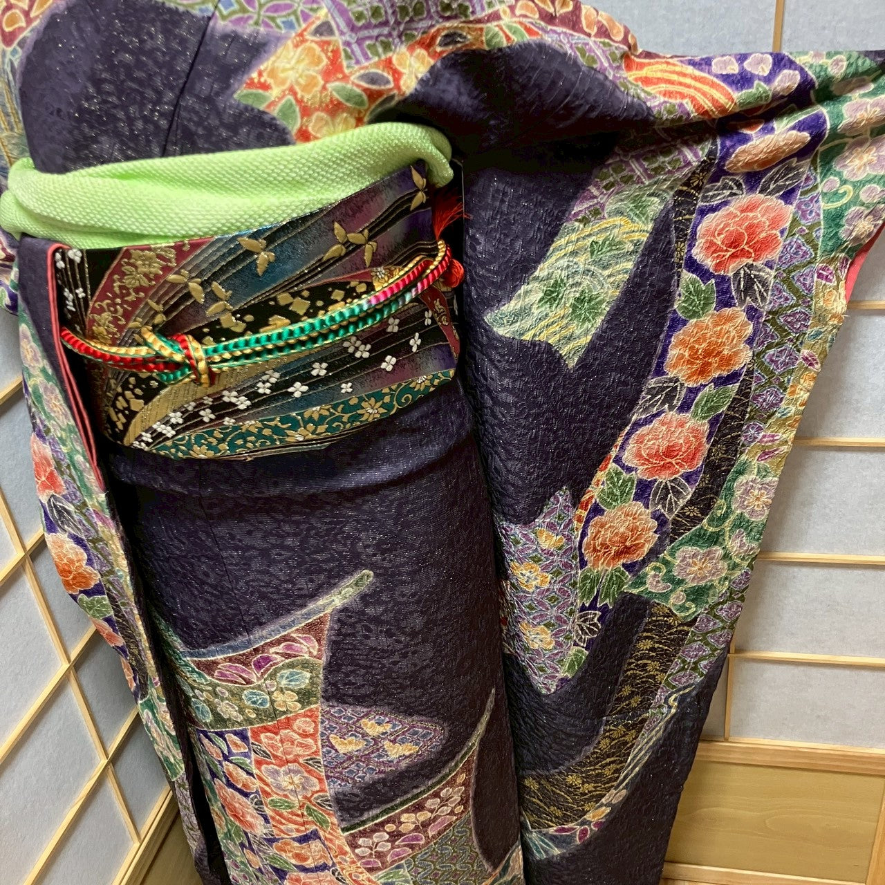 This set includes a furisode, a pouch obi, an obijime, and an obiage!