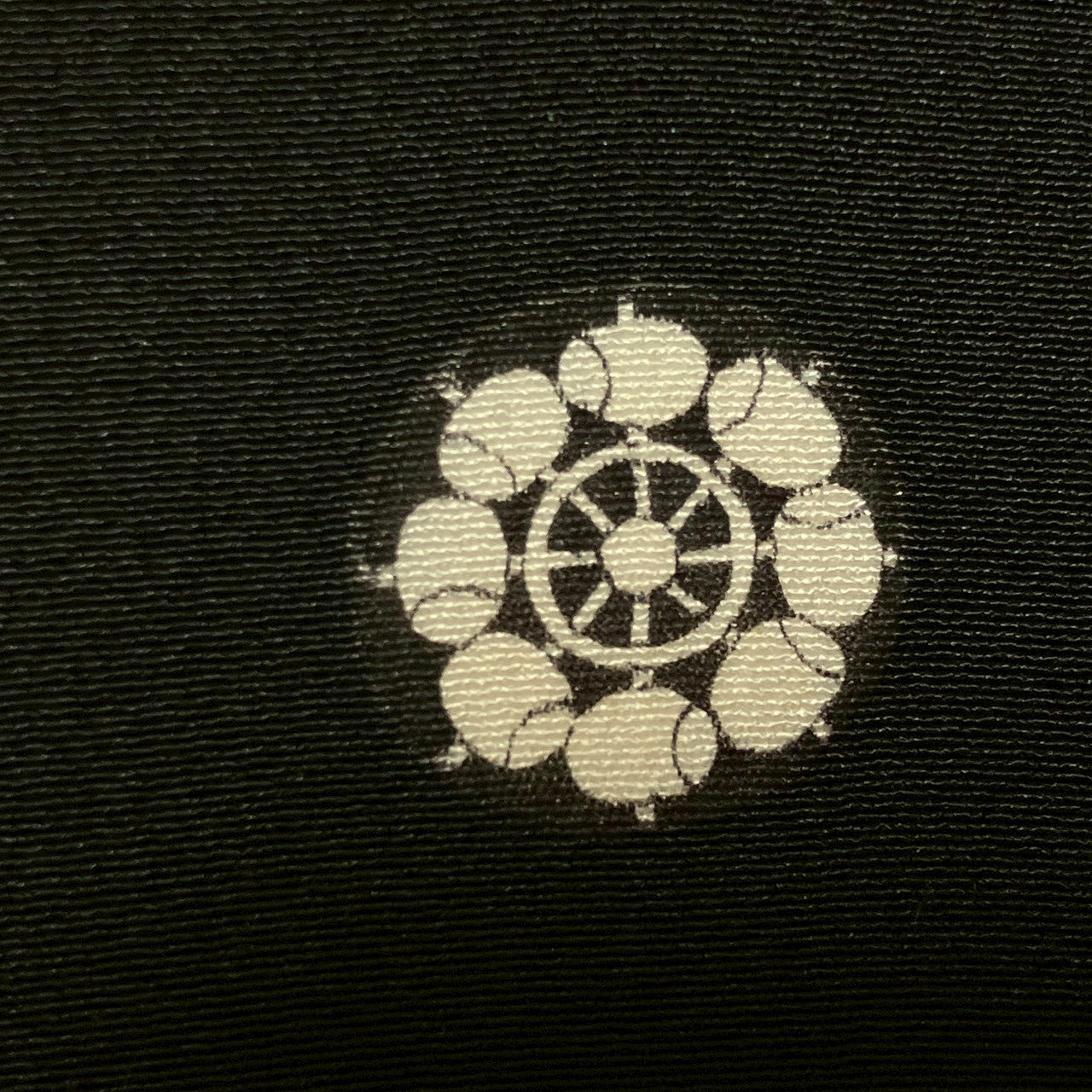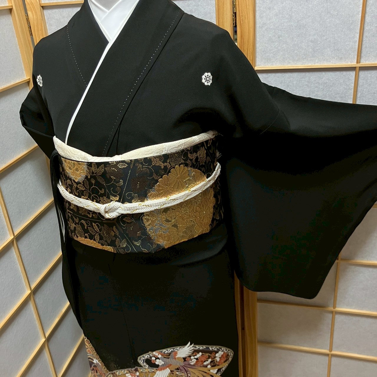 This is a black tomesode with fan, flower and phoenix design, artist's work.