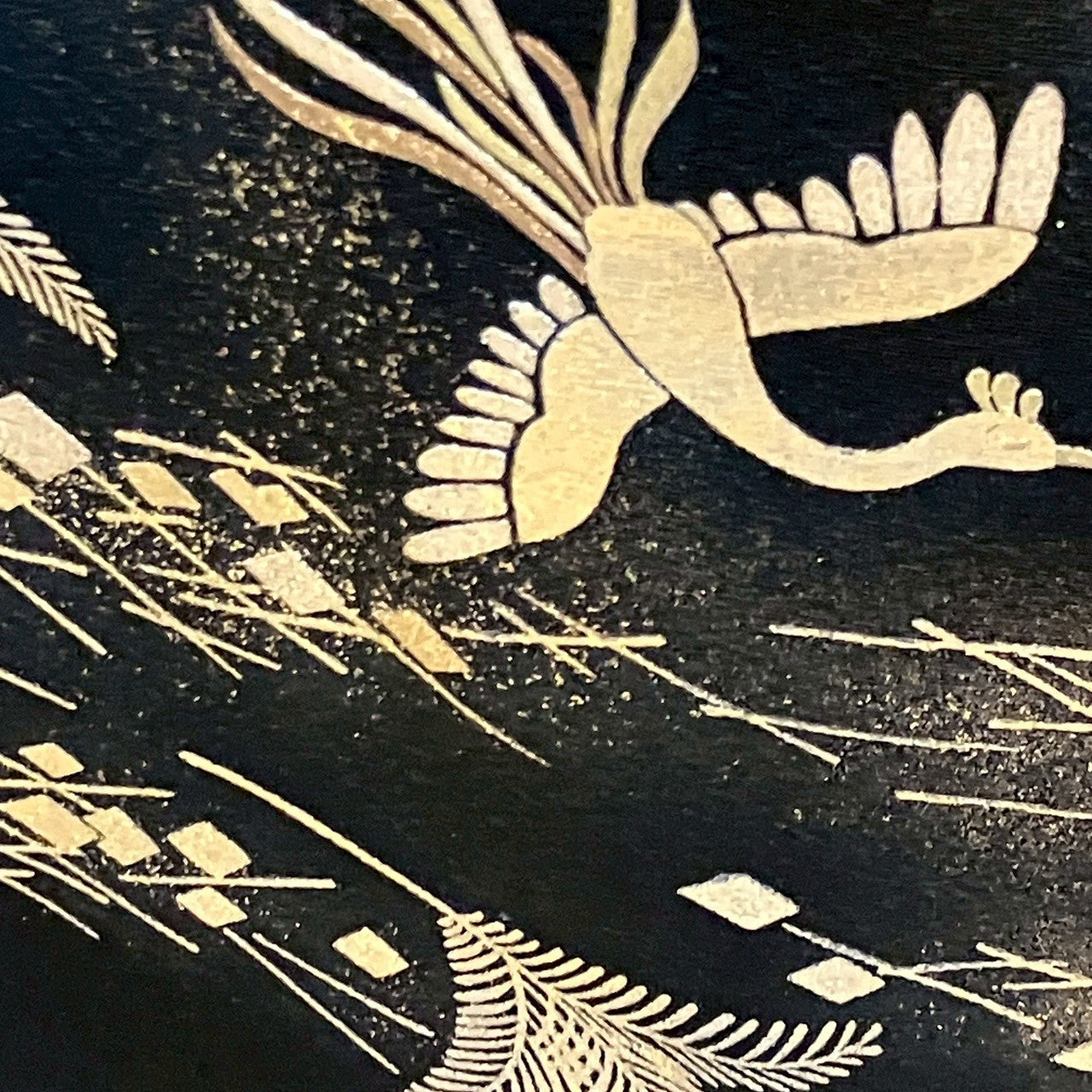 This is a black tomesode with embroidery, phoenix and flower design, gold and silver coloring.