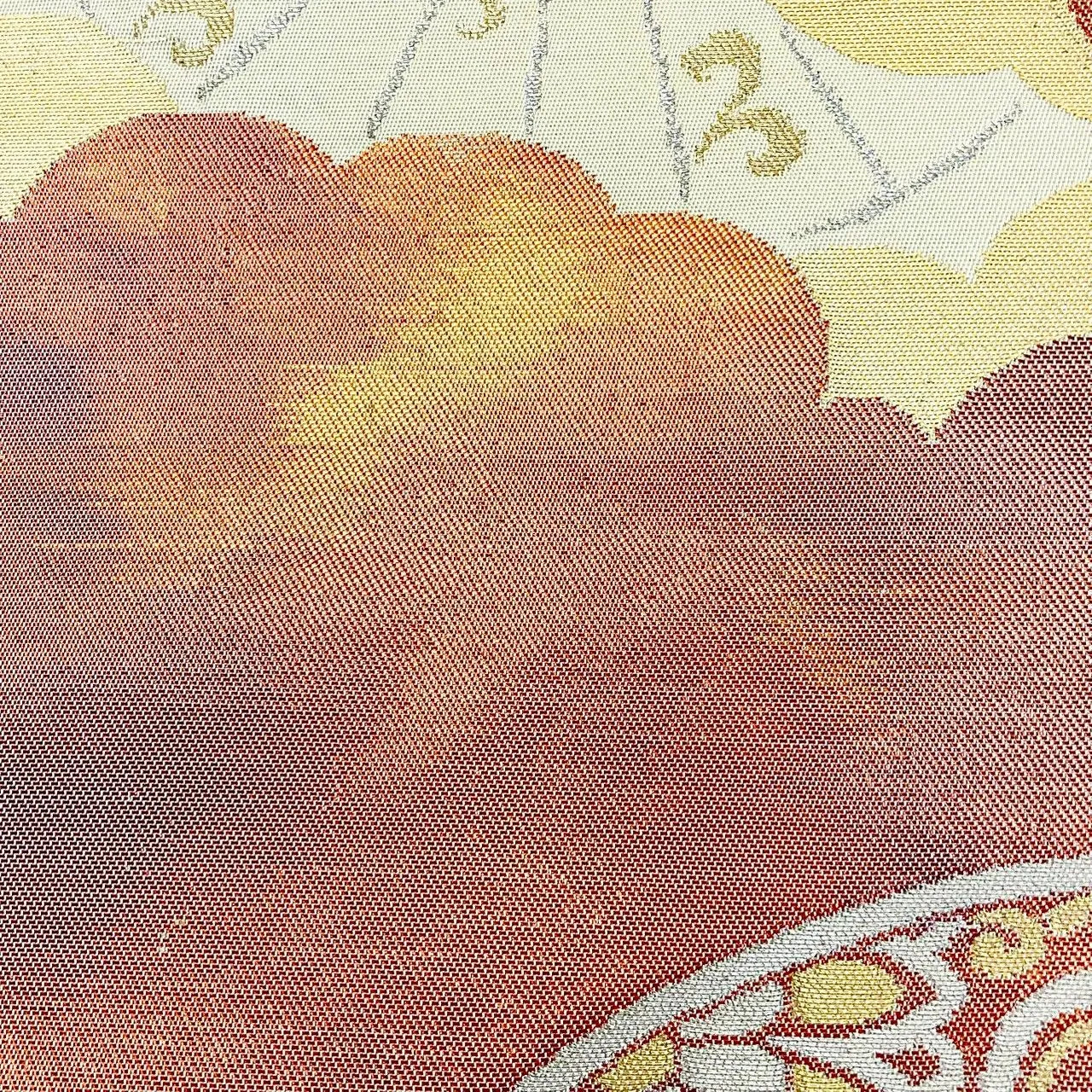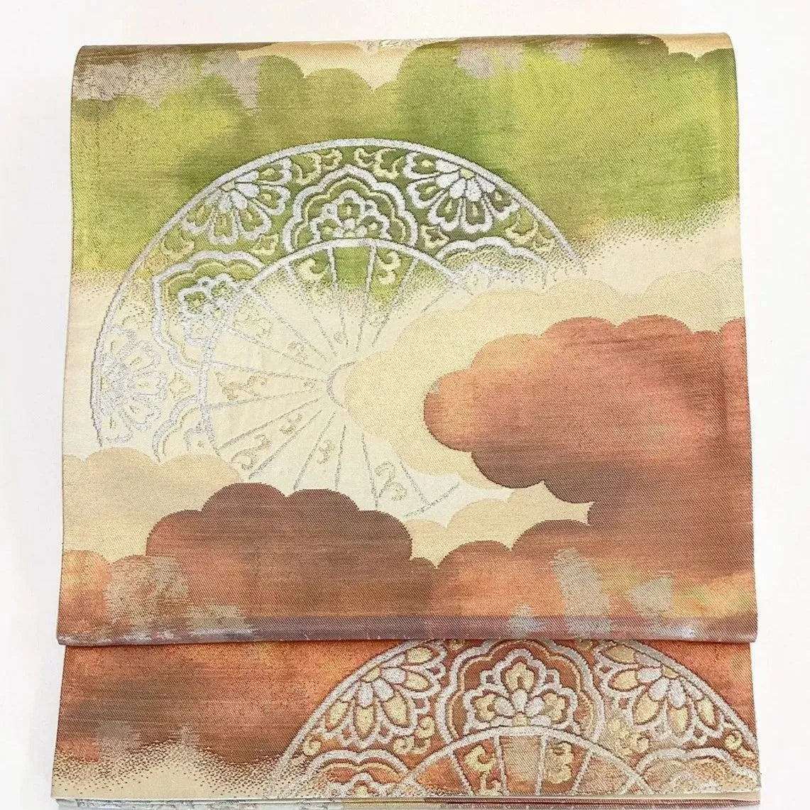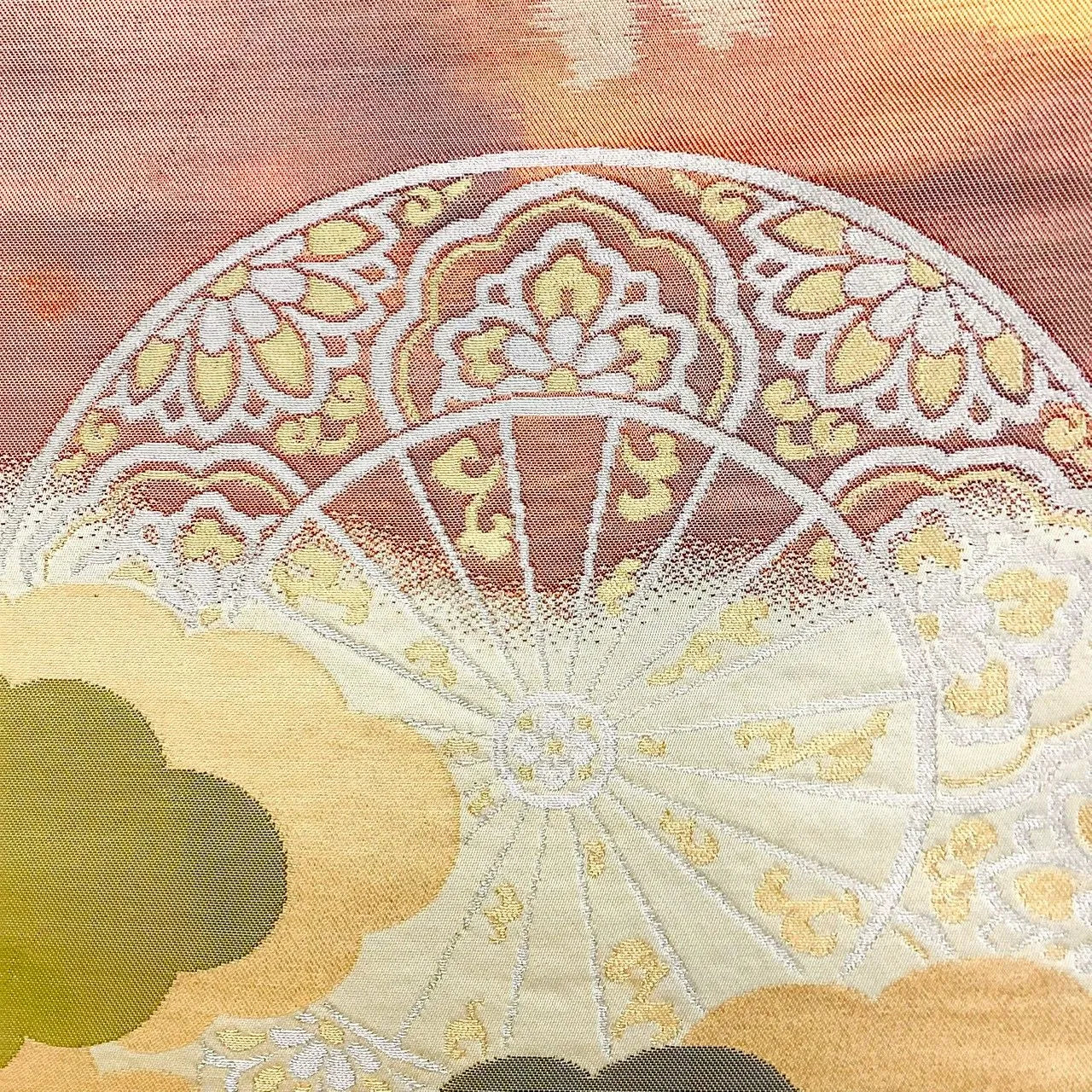 This is a pouch obi with a pattern of clouds and mirrors on the reverse side.