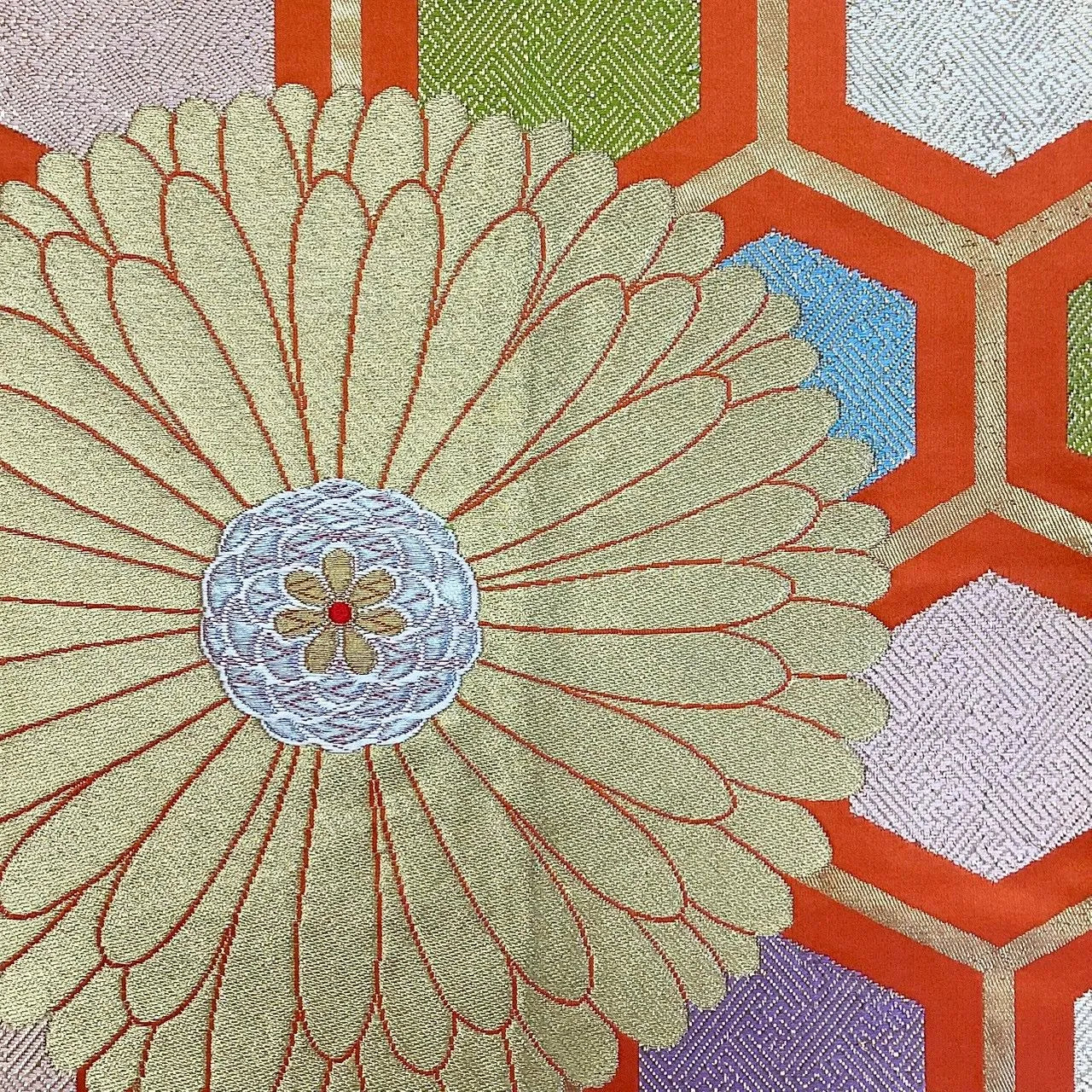 This is a pouch obi with chrysanthemum design and gold and silver threads.