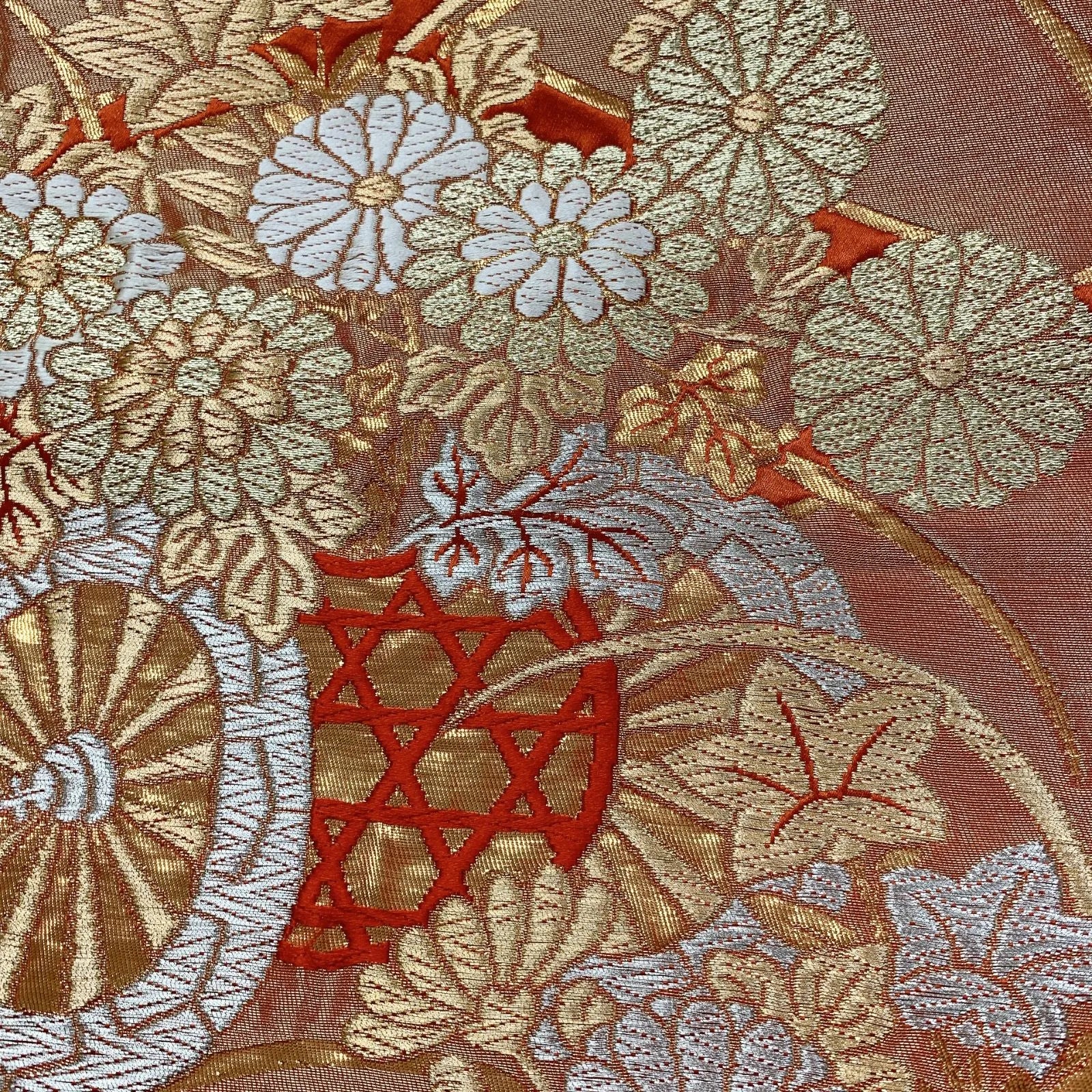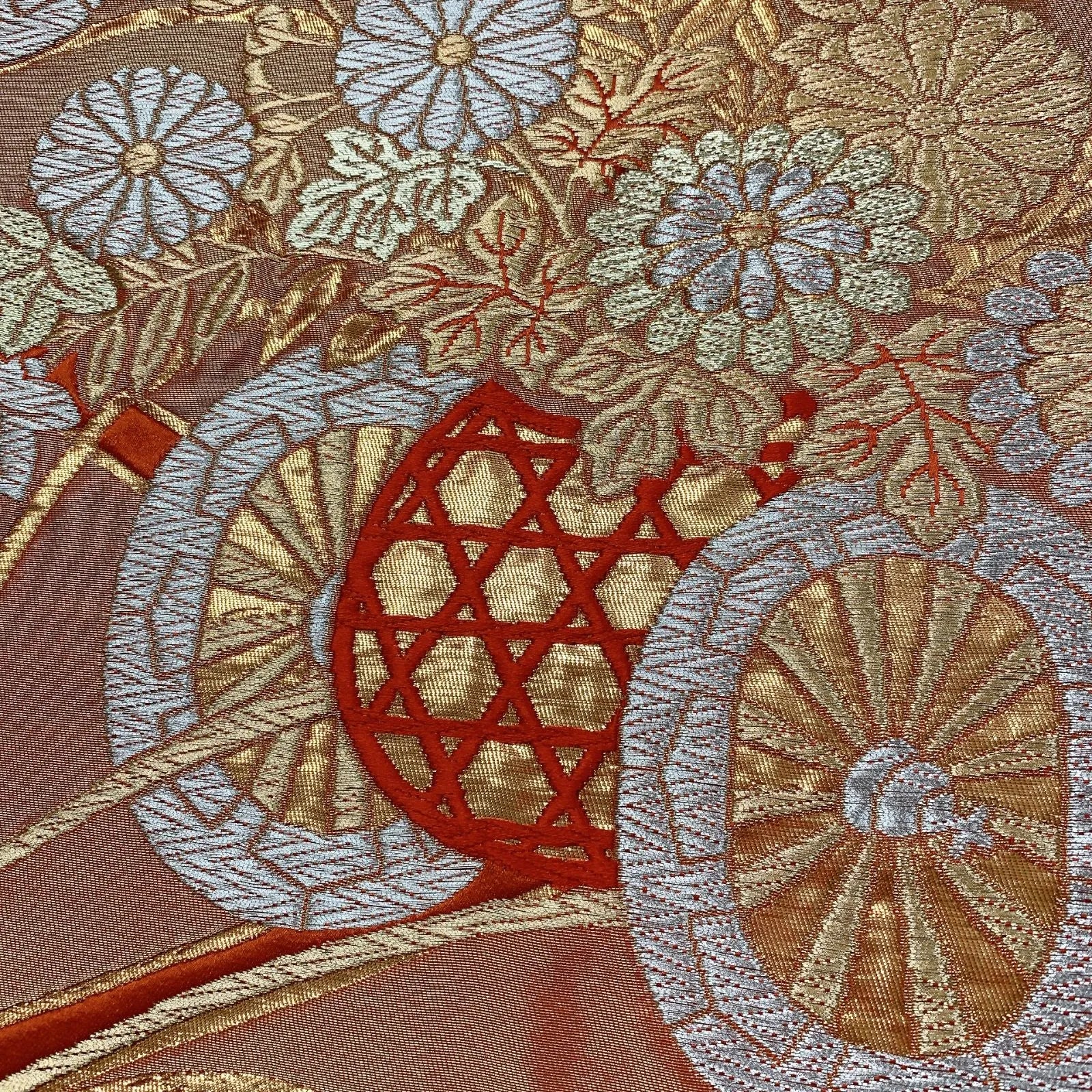 This is a pouch obi with a flower and wheel design in gold and silver.