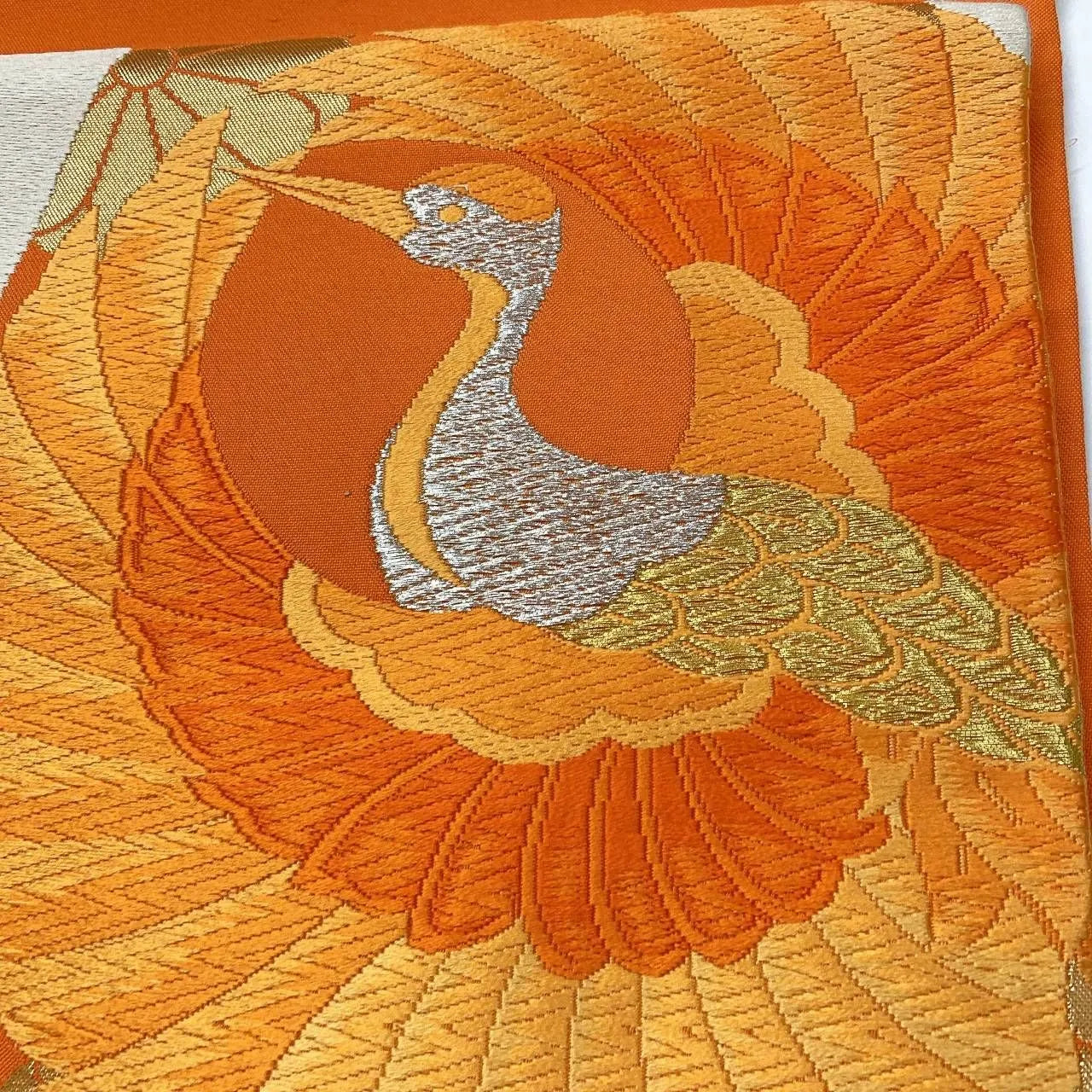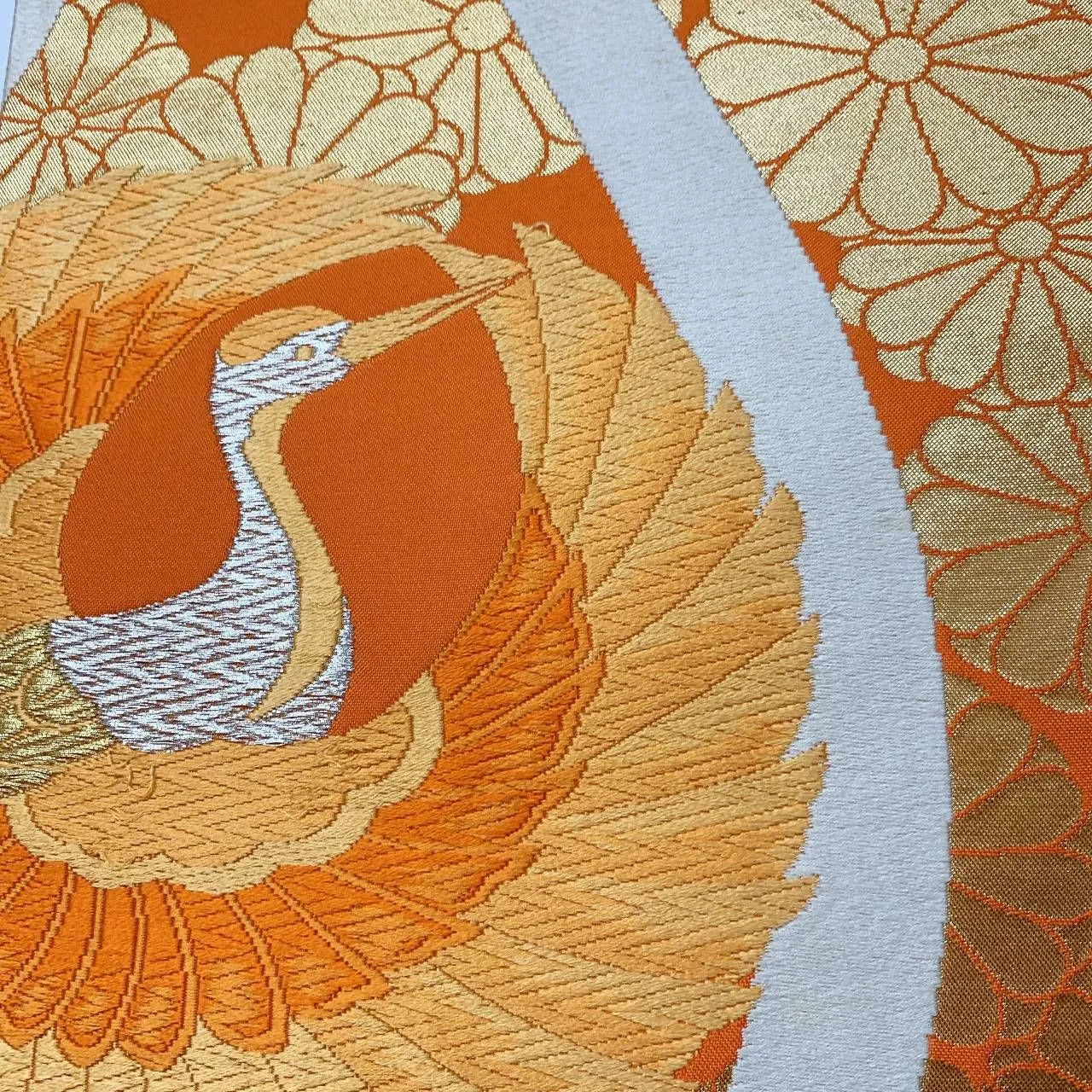 This is a pouch obi with a crane and chrysanthemum design.