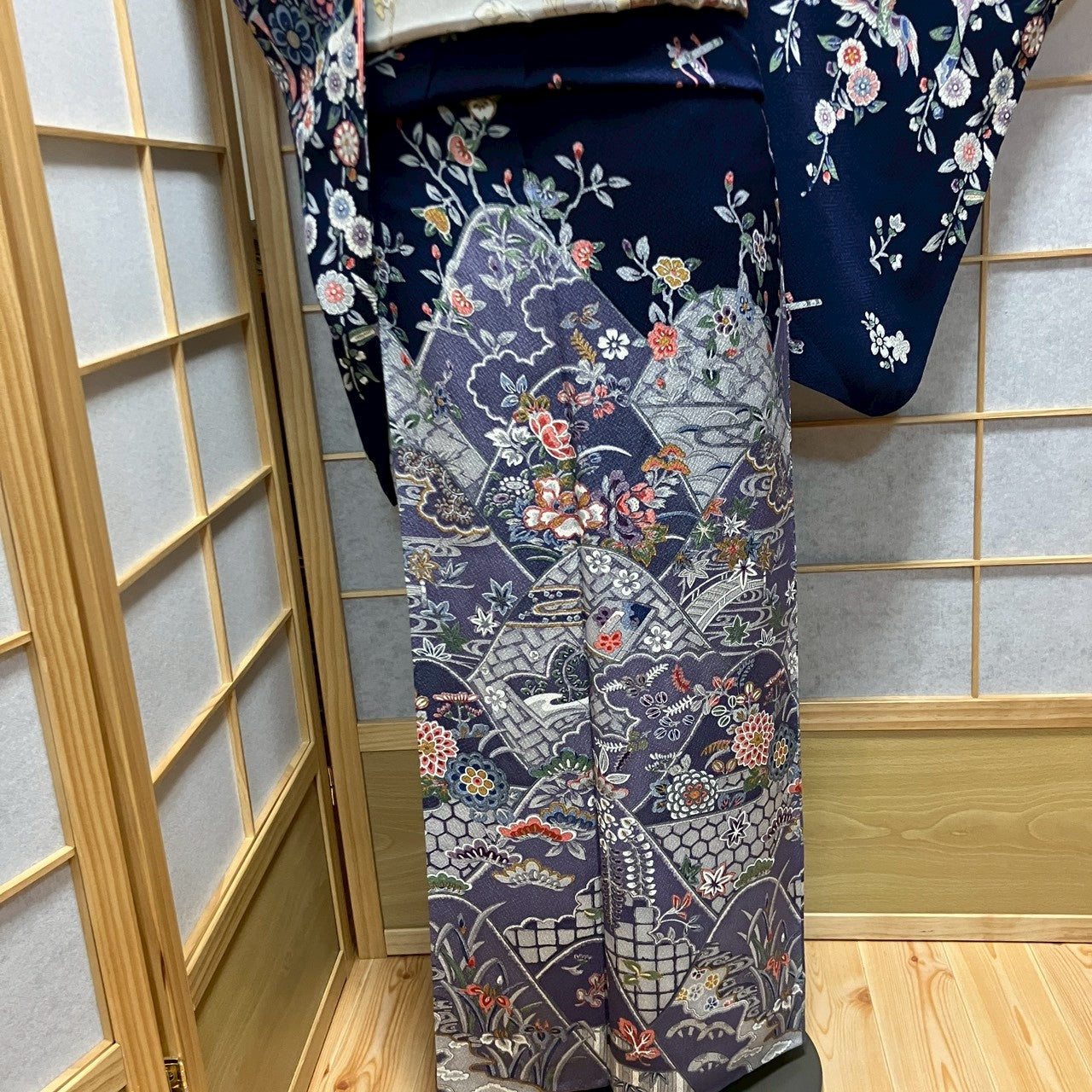 6441# Japanese Kimono Vintage Womens Silk Fabric Robe Kimono only sold Navy blue
