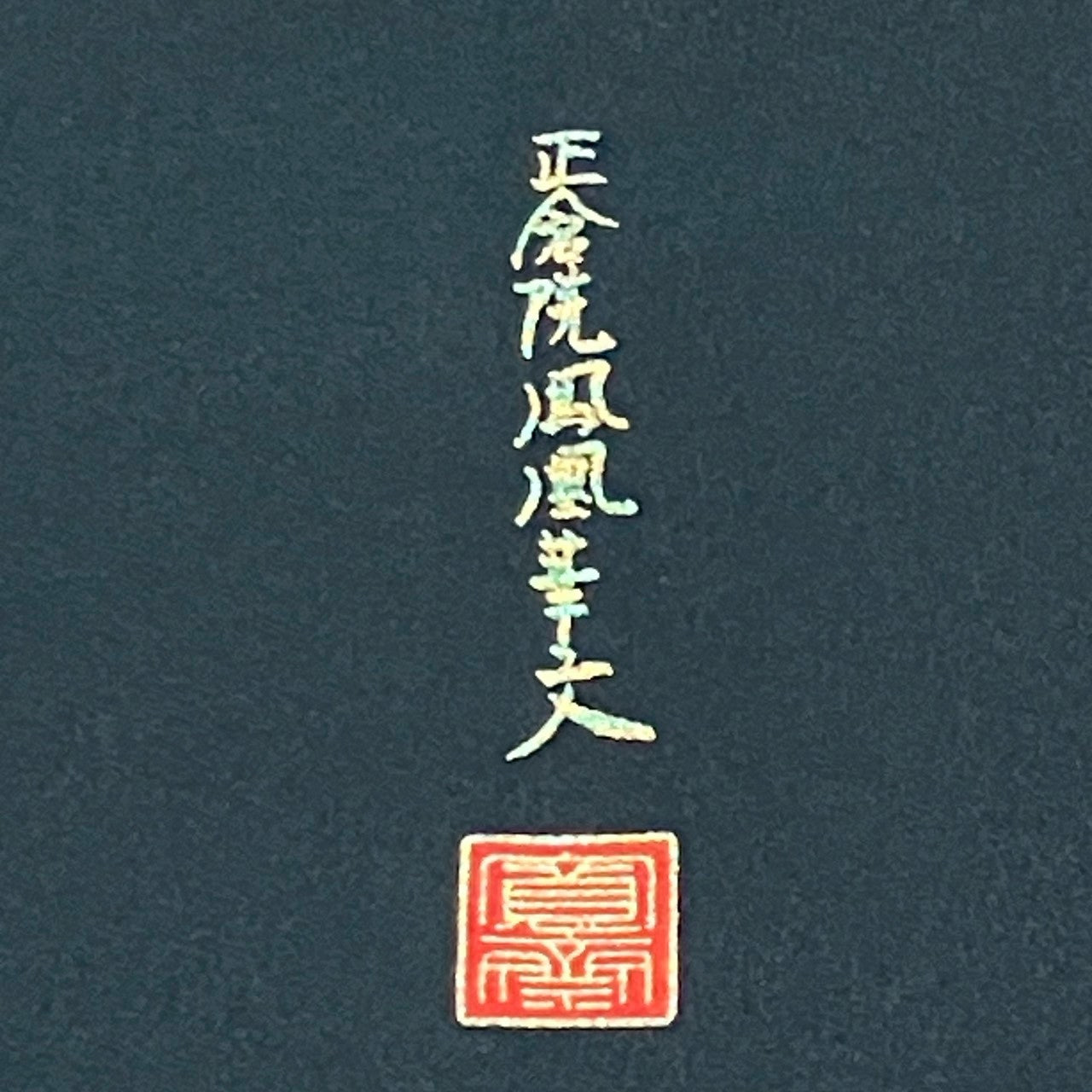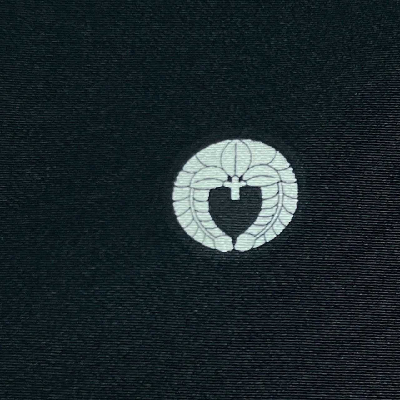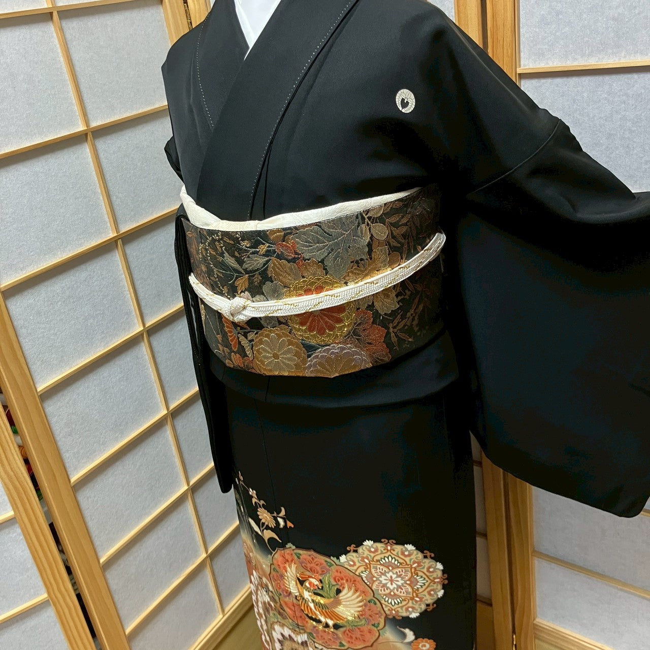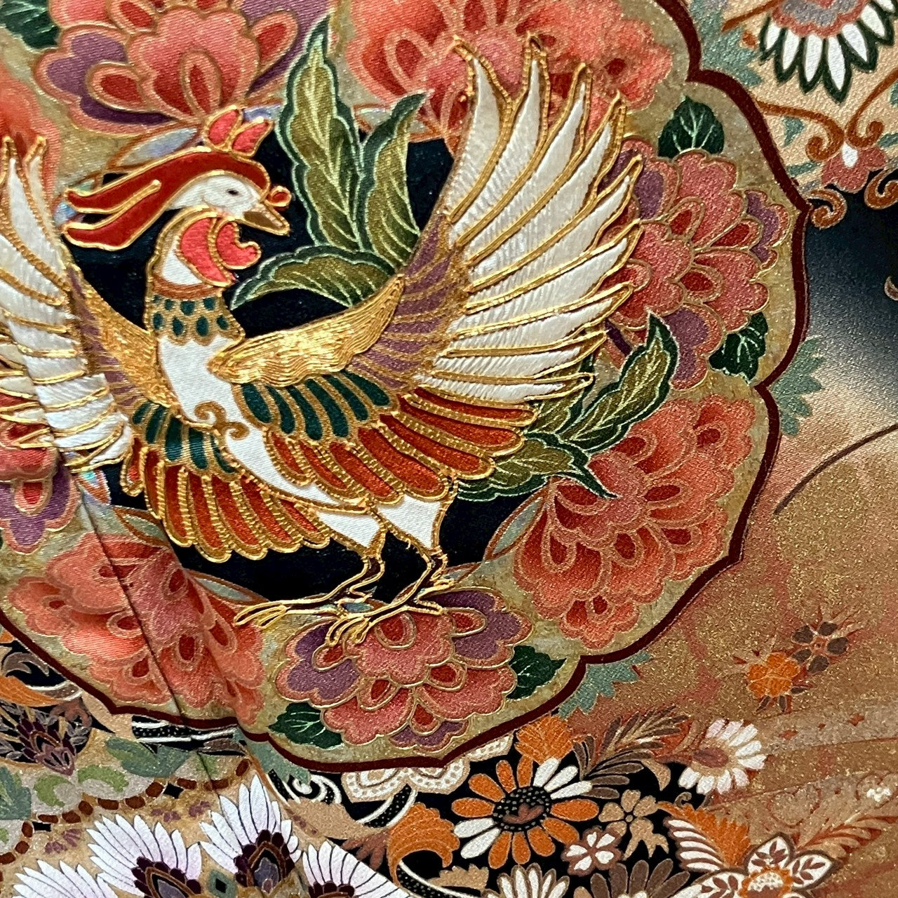This is a black tomesode with phoenix design, gold coloring, and five crests.