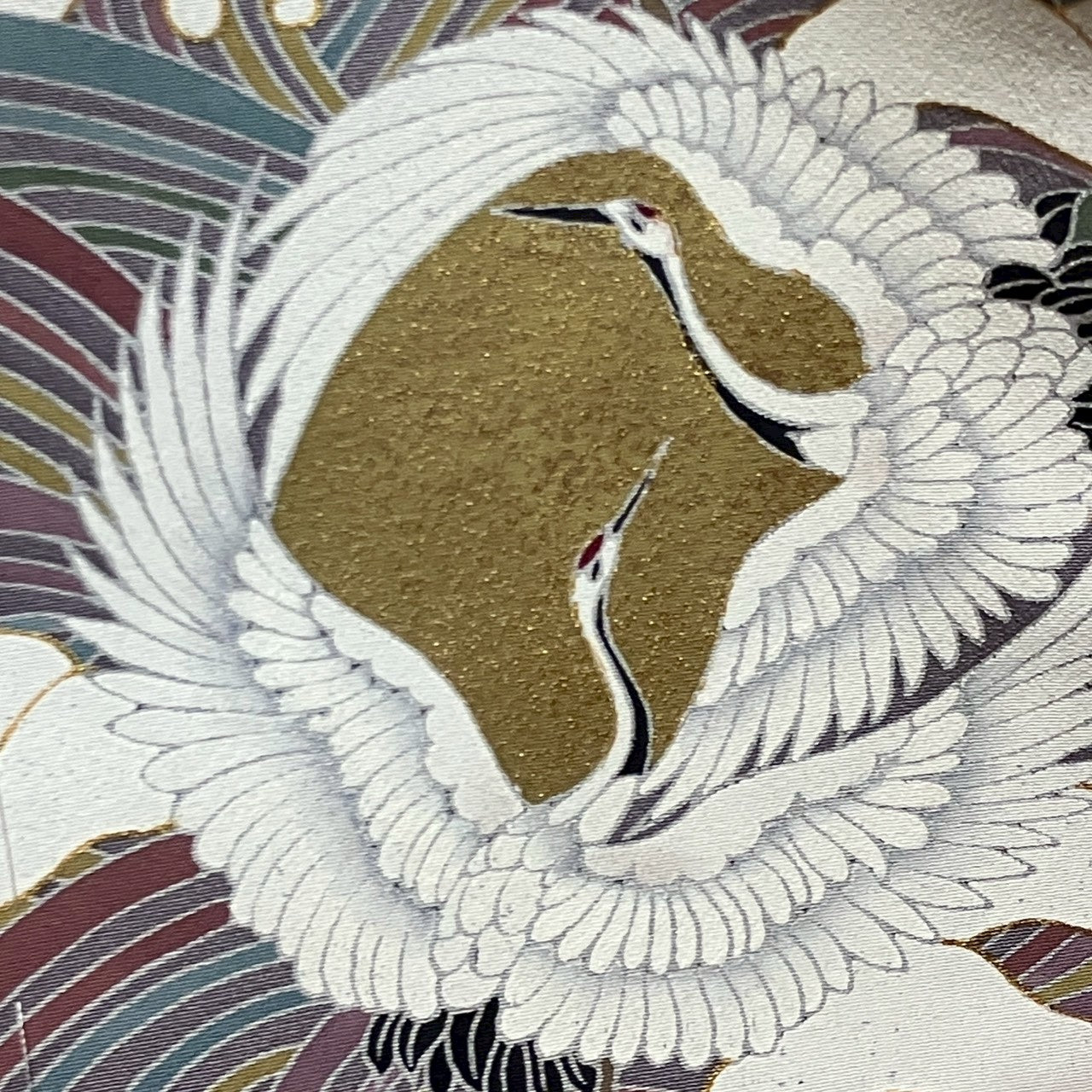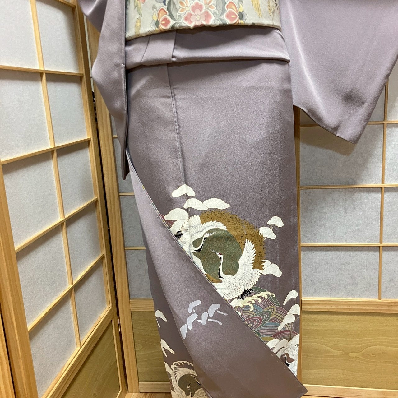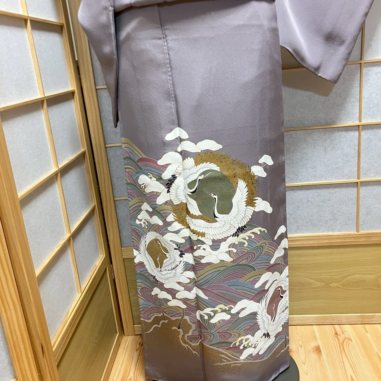 This is an unused, wave, crane, and pine tree design, single crest, colored tomesode.