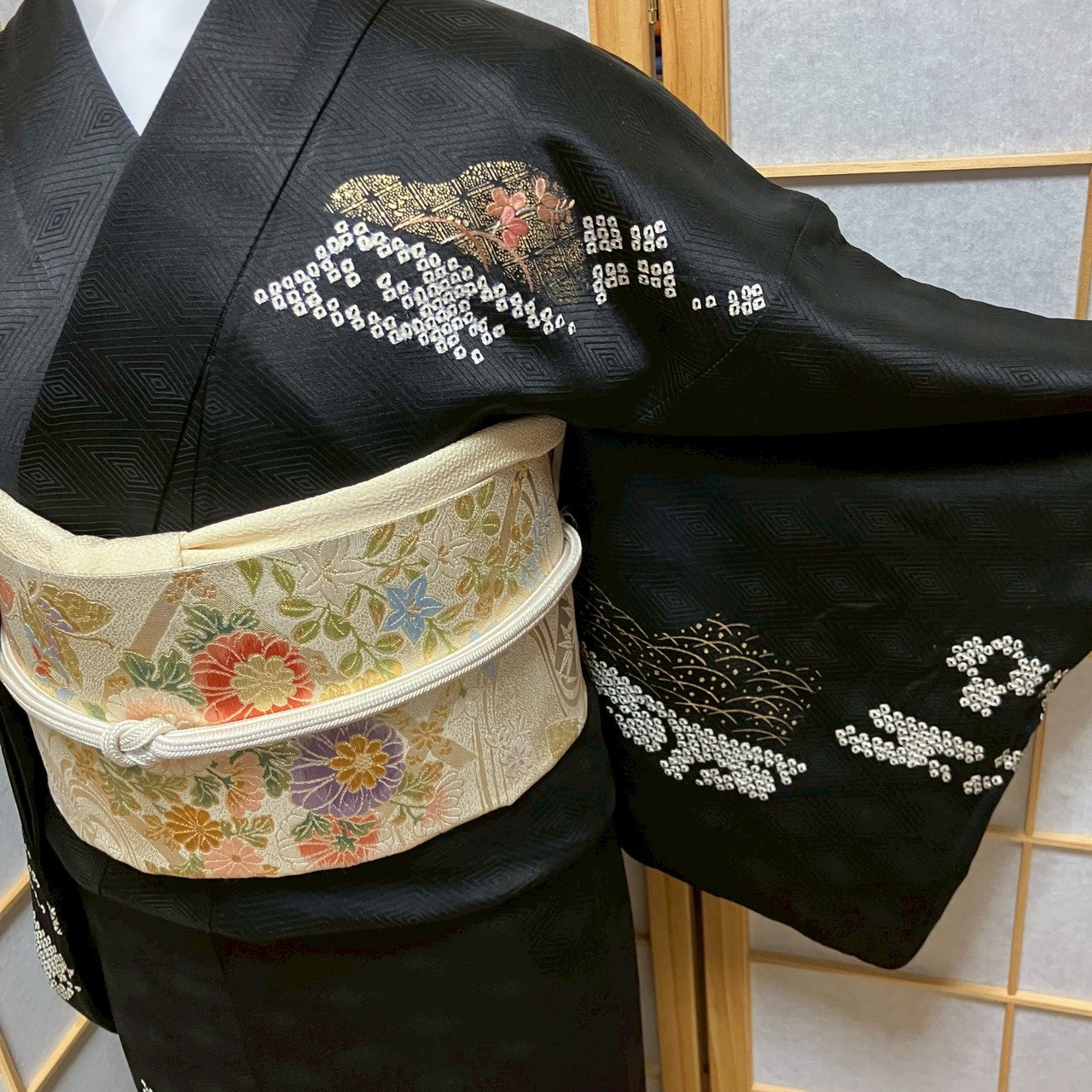 Visiting kimono with floral and shibori patterns.