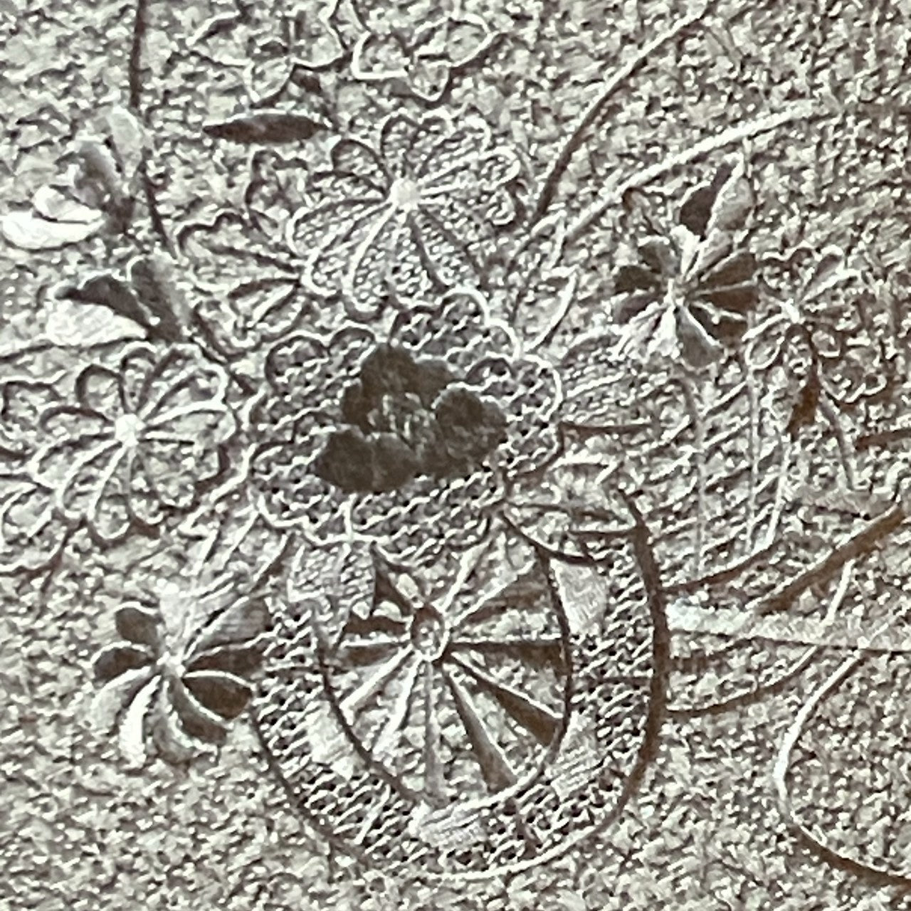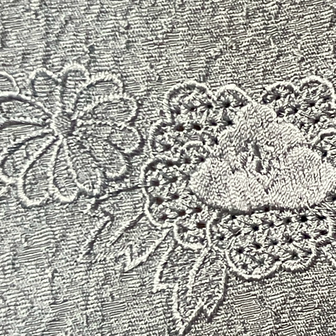 This is a visiting gown with a flower and wheel design embroidered by Swatow.