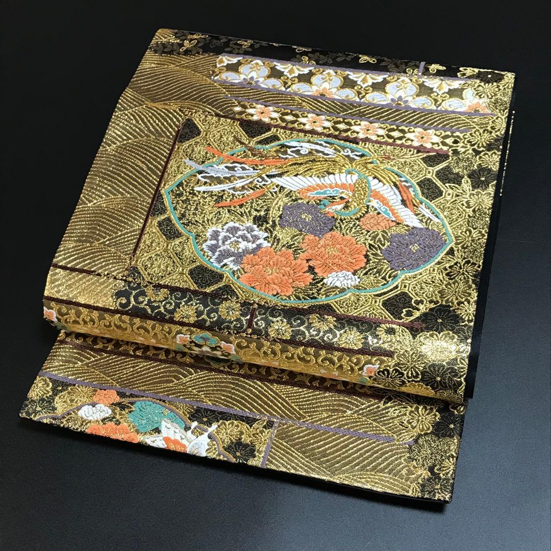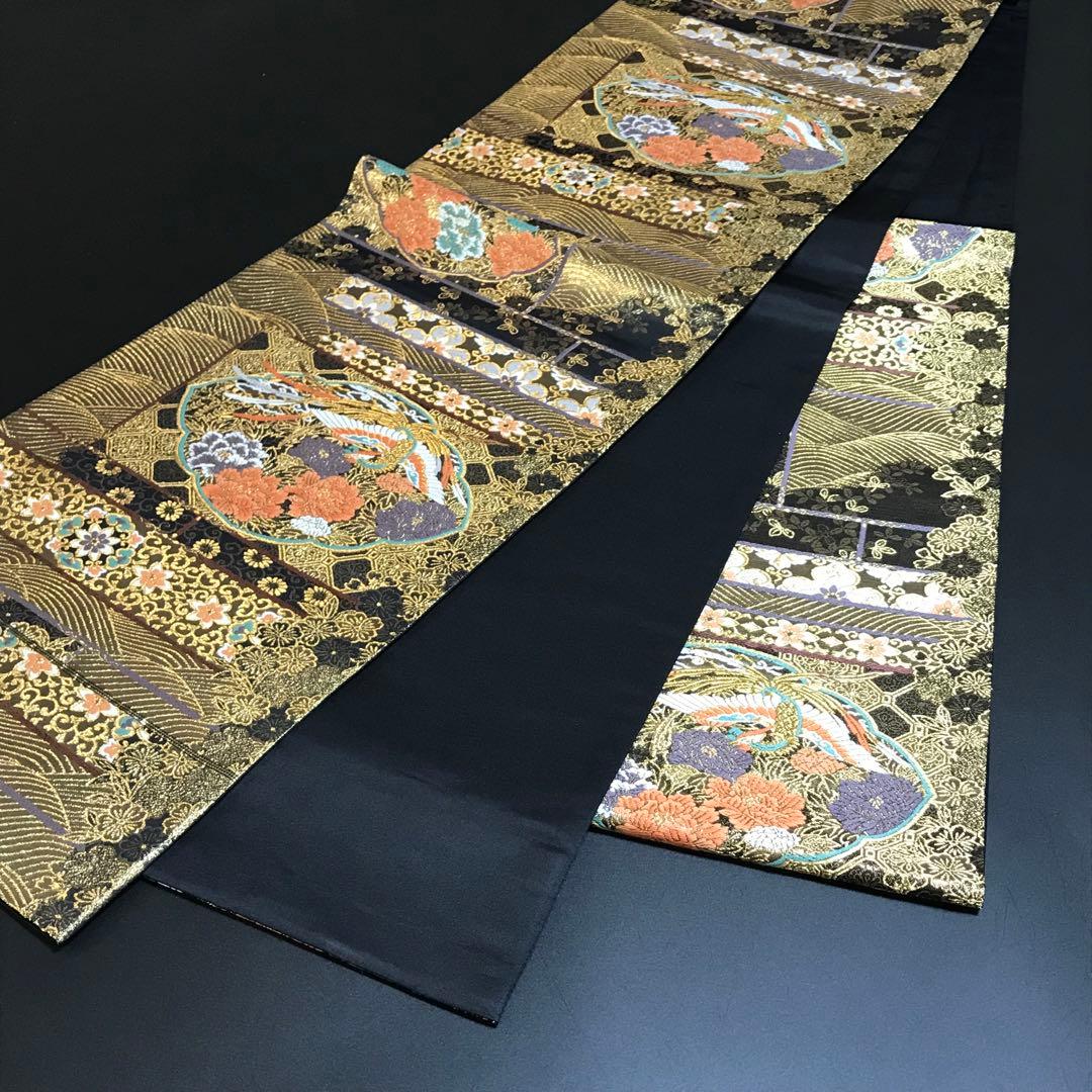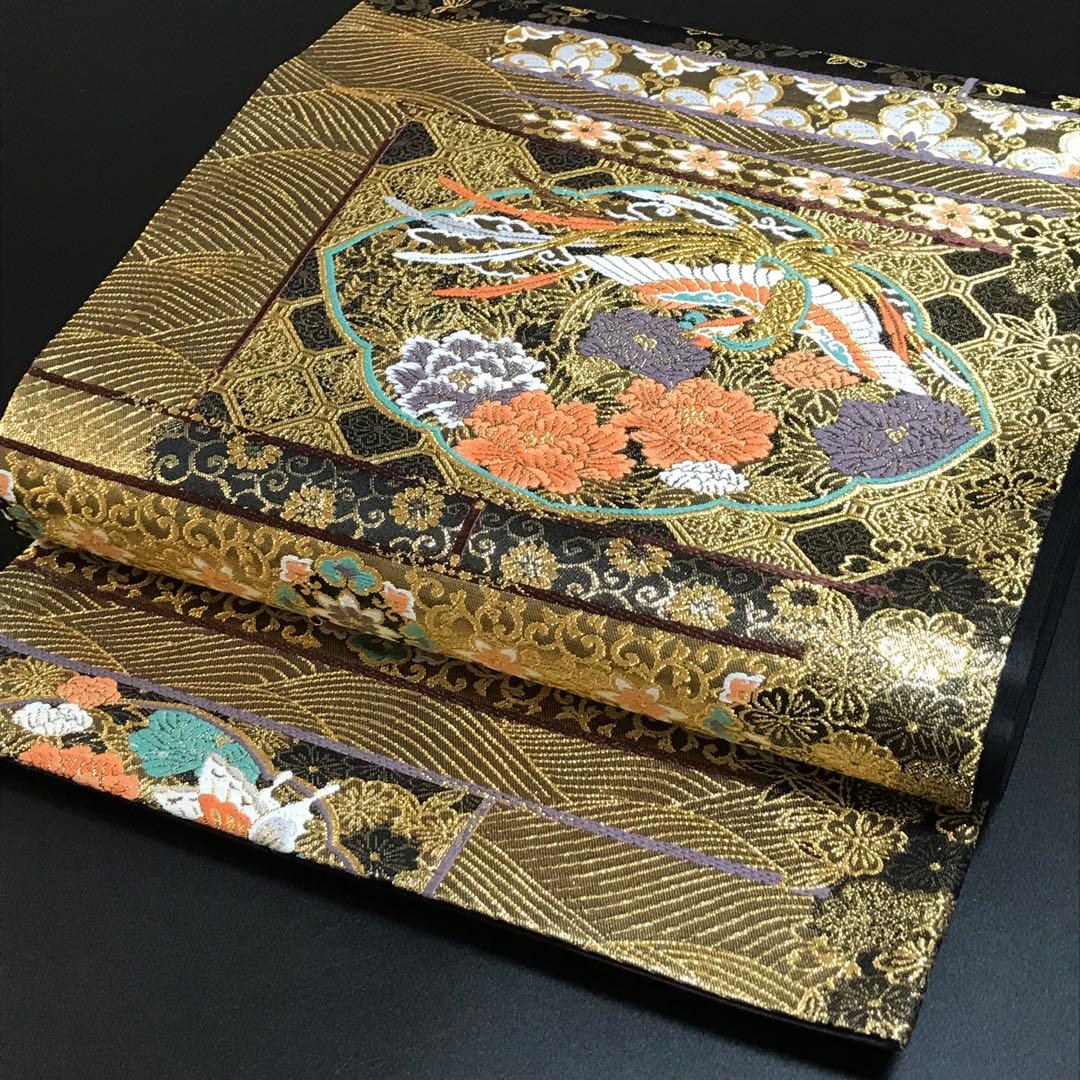 This is a pouch obi with a phoenix, flower, and wave design and gold thread.