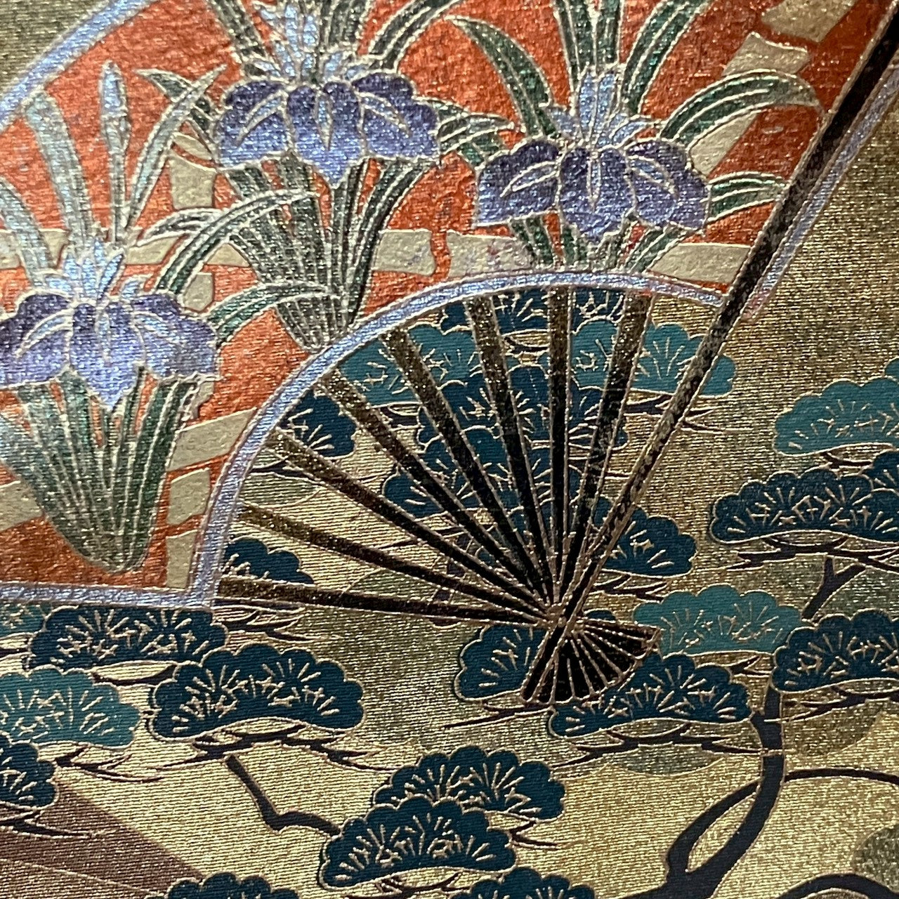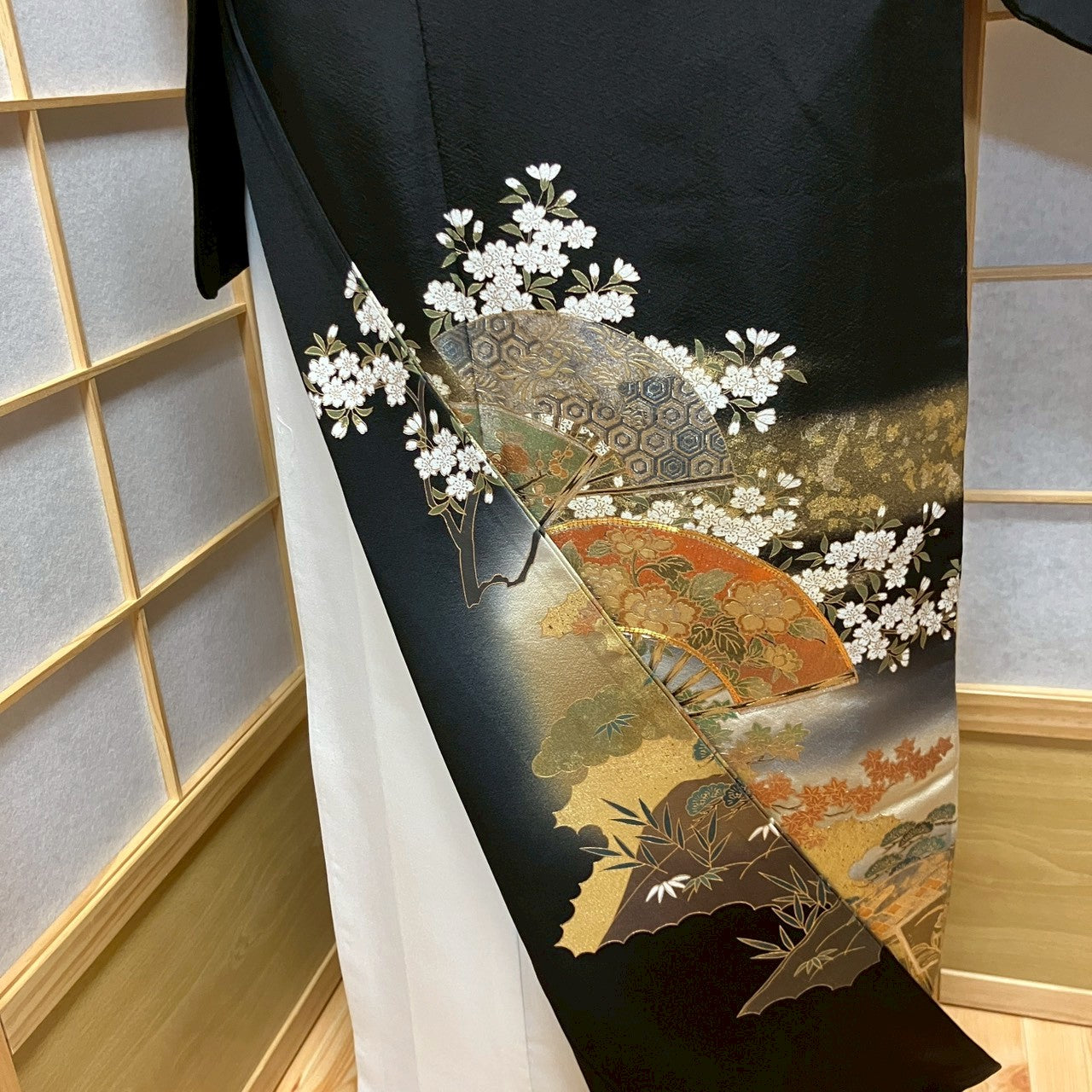 This is a black tomesode with fan and flower design, embroidery, and gold and silver coloring.