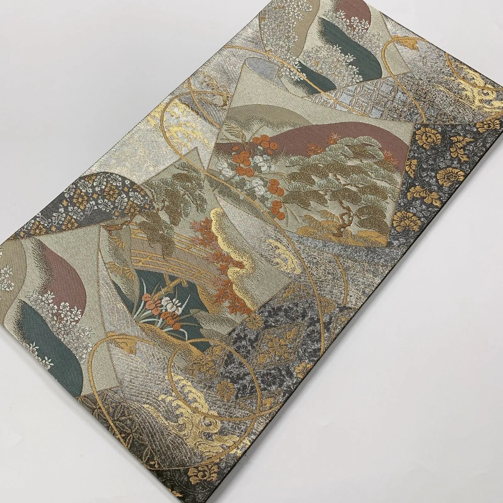 This is a pouch obi with a floral design and gold and silver threads.
