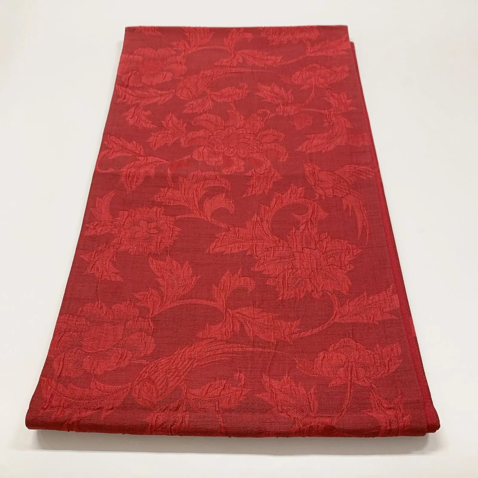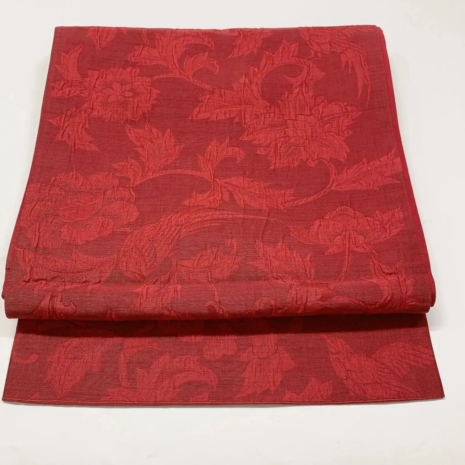 This is a pouch obi with a floral arabesque design and all-through pattern.