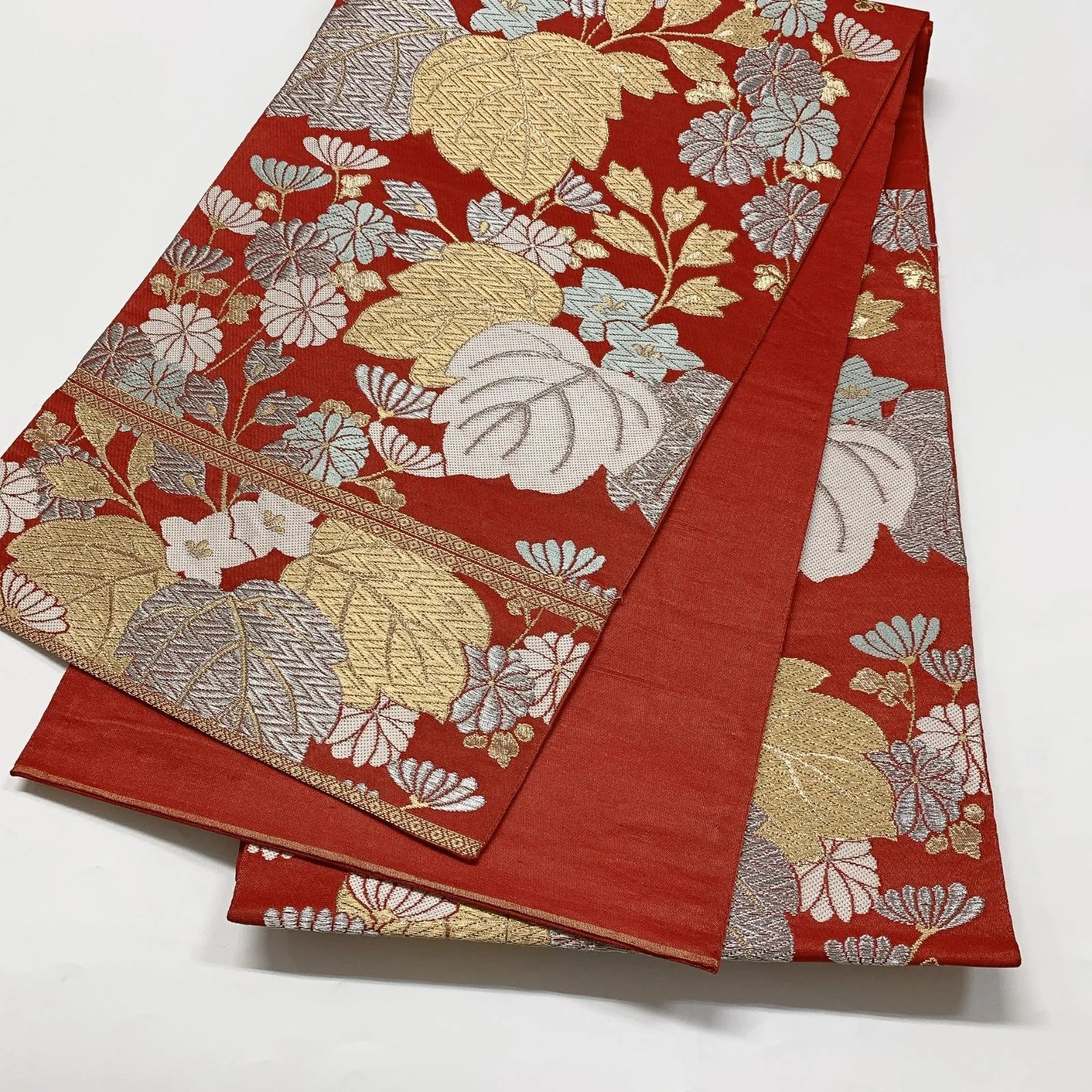 This is a pouch obi with gold and silver threads.