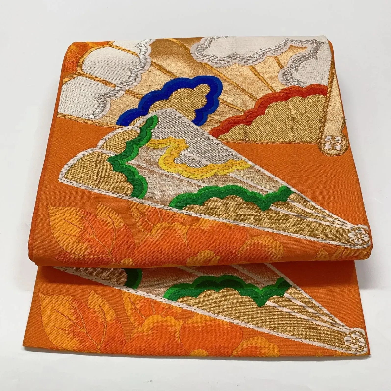 This is a pouch obi with a fan and peony design.