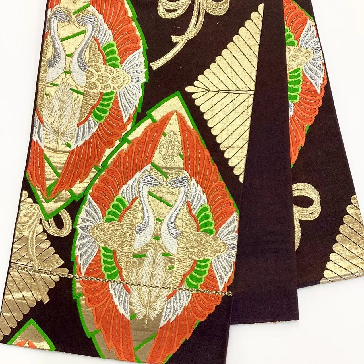 This is a pouch obi with a phoenix design and gold and silver threads.