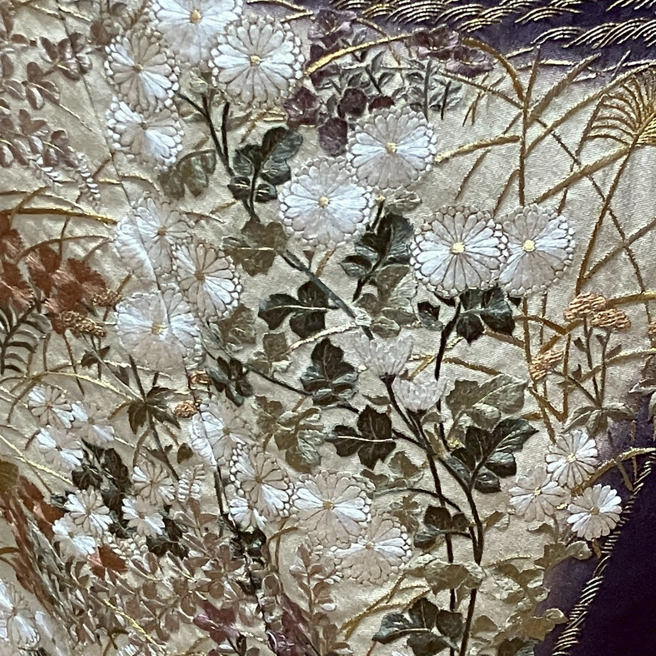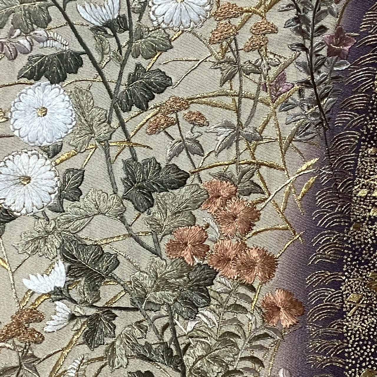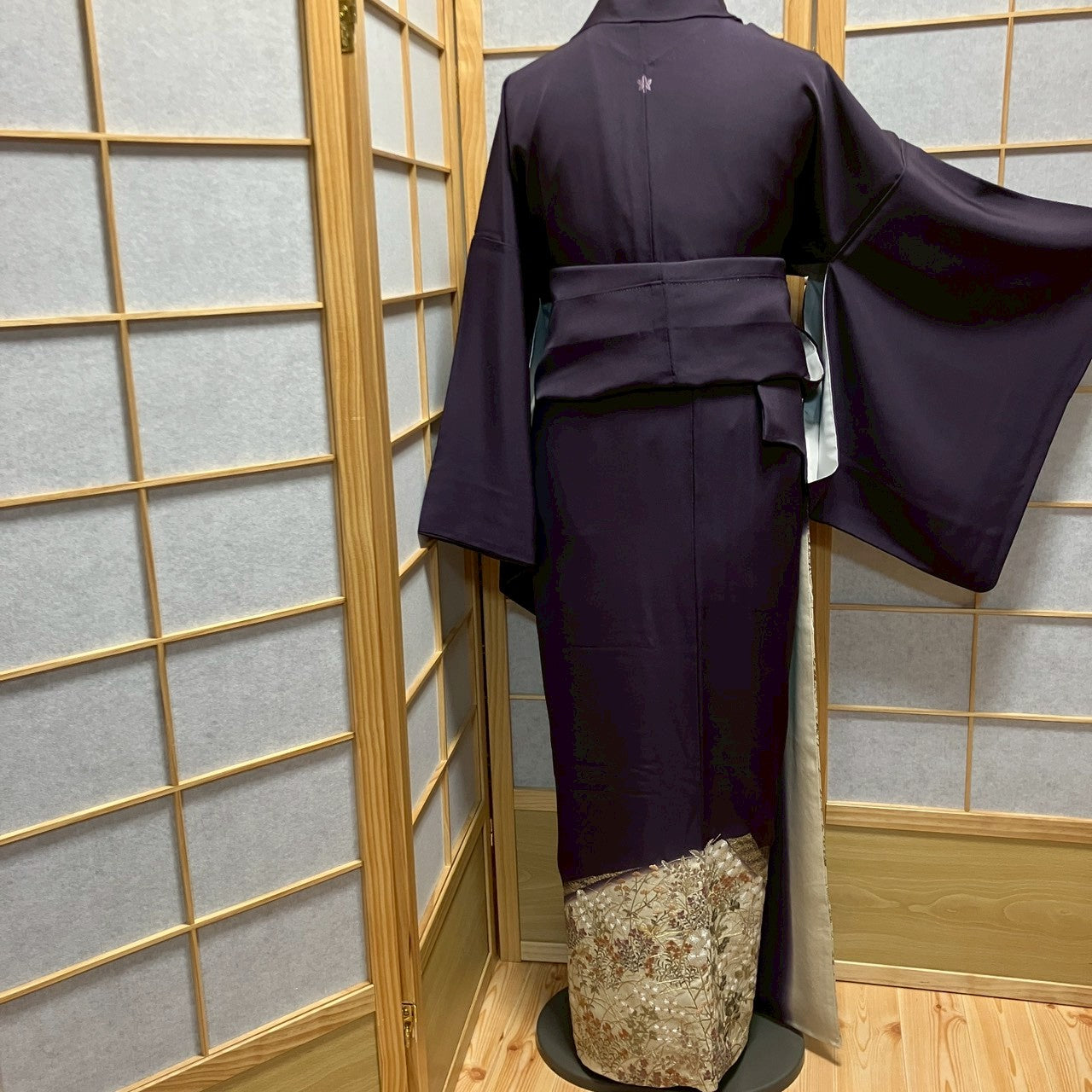 This is a color tomesode with a floral design and a single crest.
