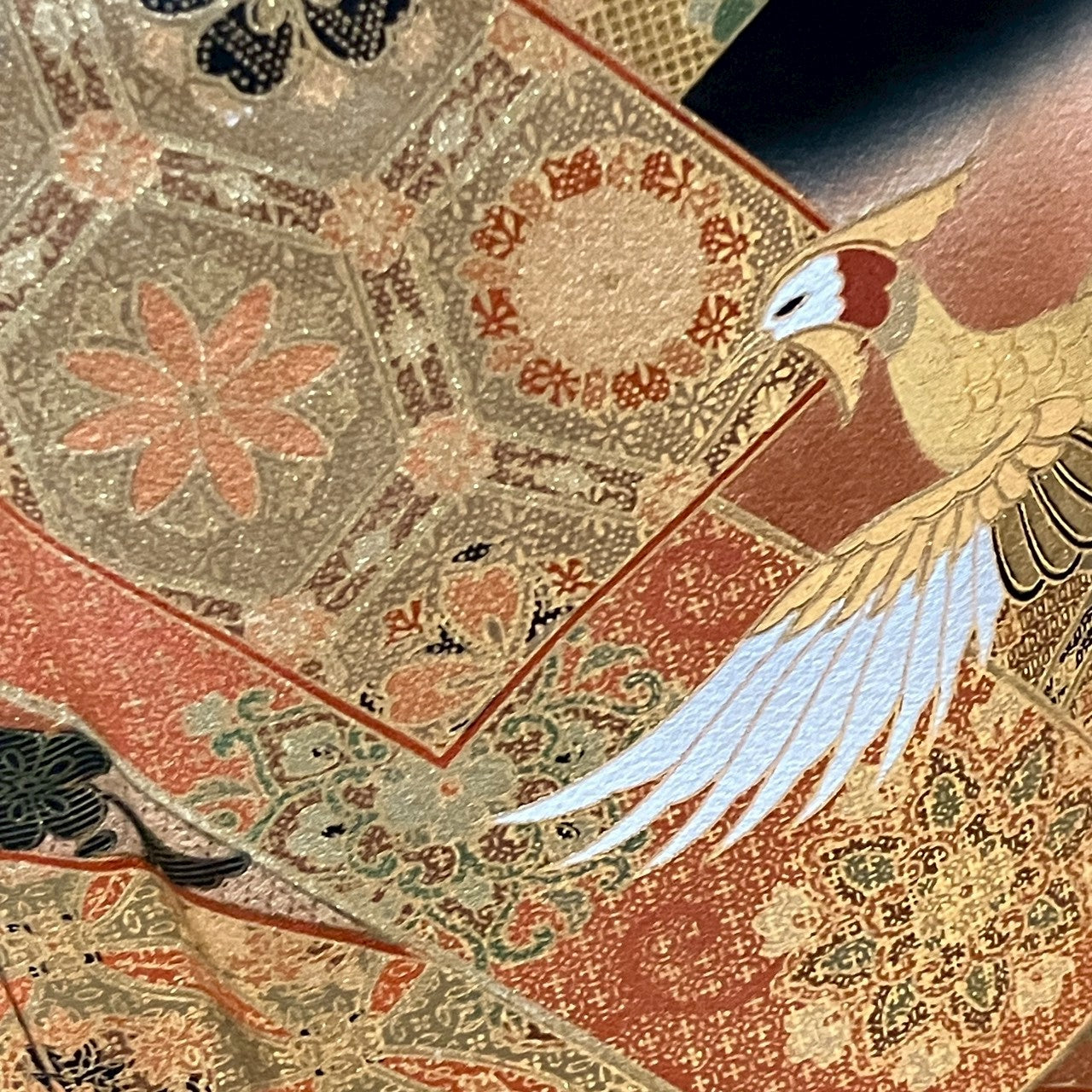 This is a black tomesode with phoenix design, artist's work, and gold coloring.
