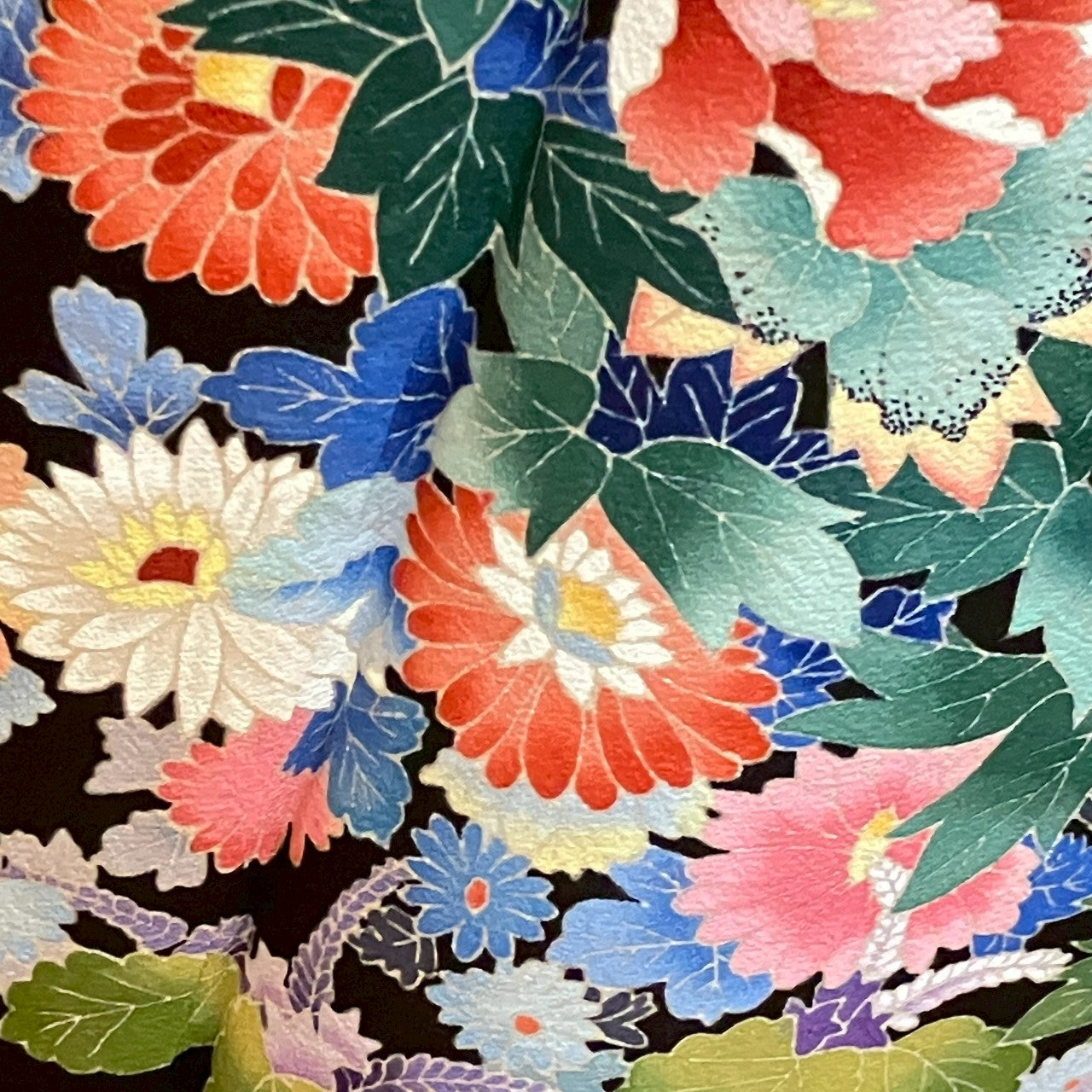 It is a black tomesode with a floral design, a signature, and five crests.