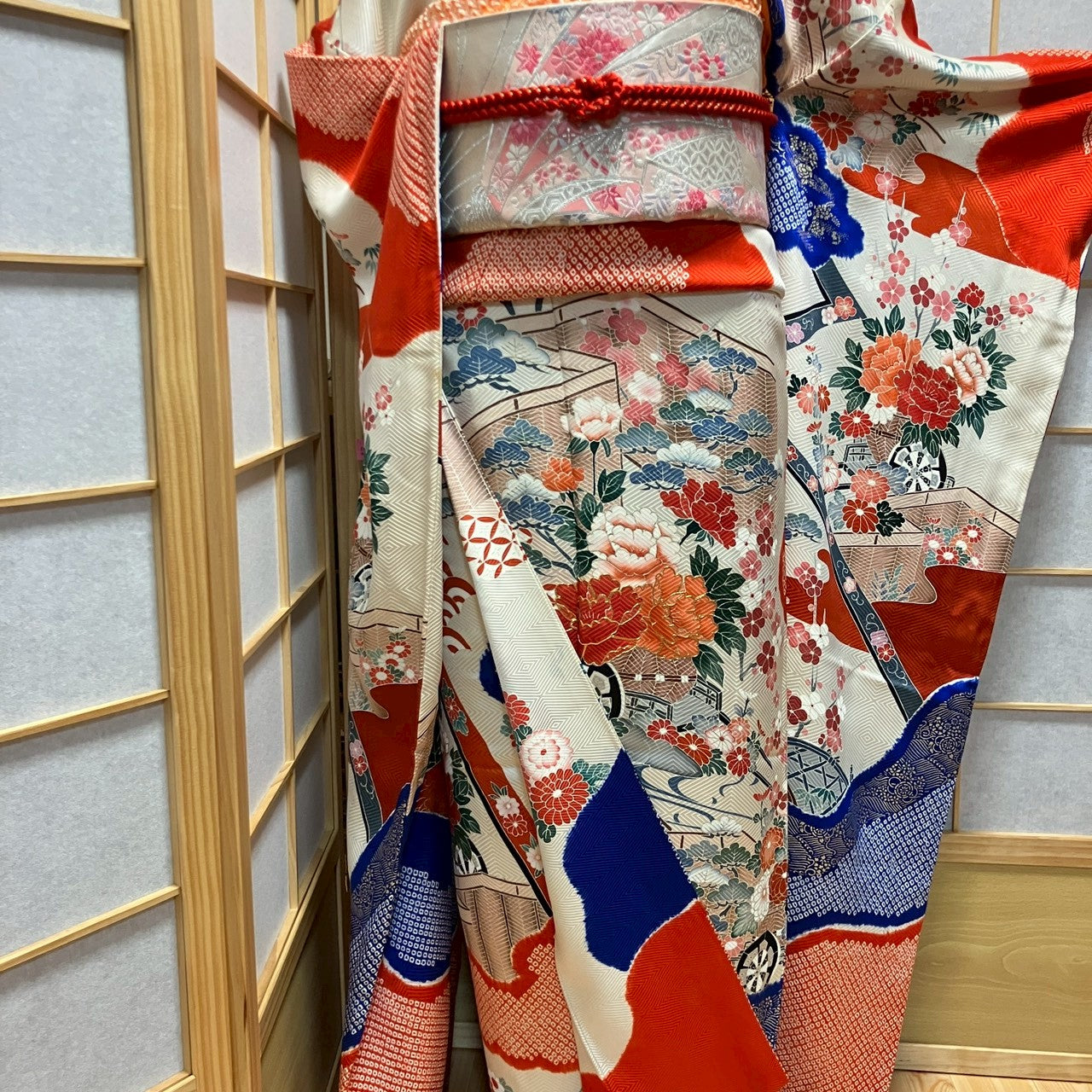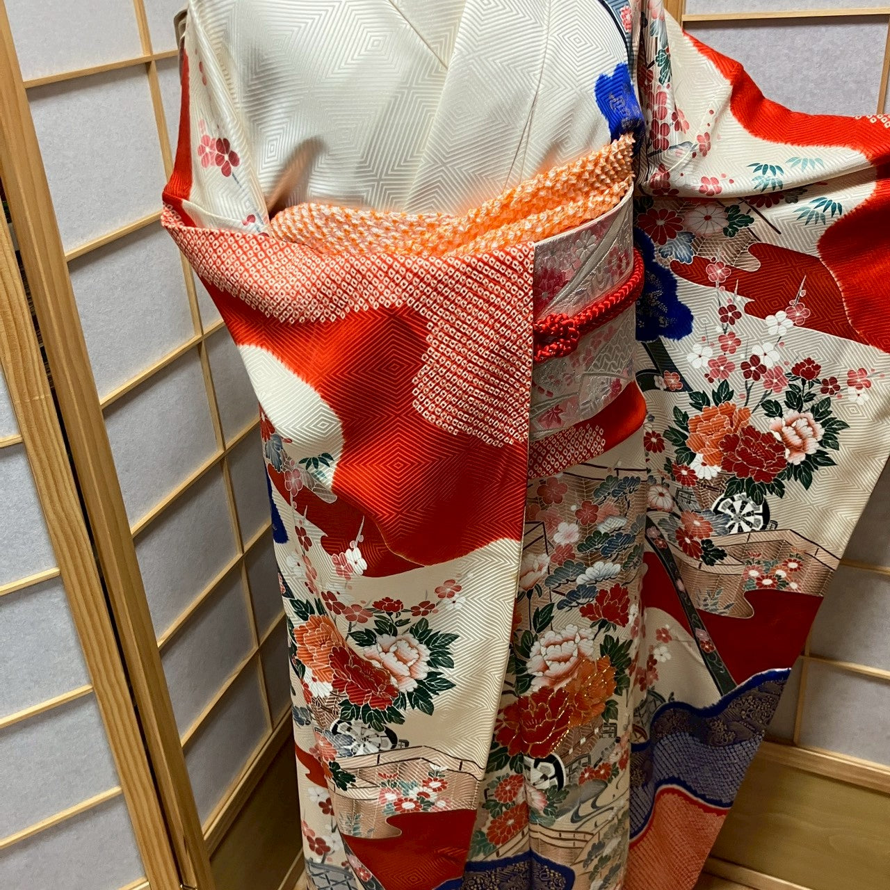 This 4-piece set includes a furisode (long-sleeved kimono), obi sash, and obiage!