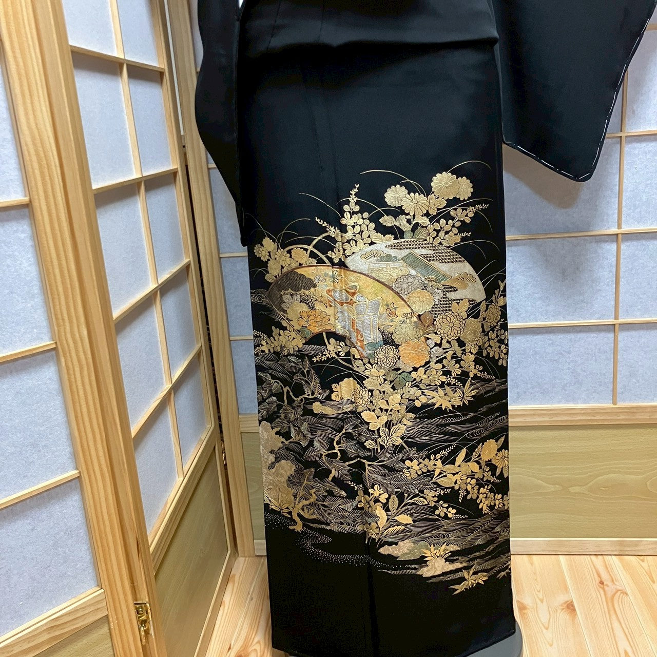 It is a black tomesode with fan, car and flower design, gold and silver coloring.