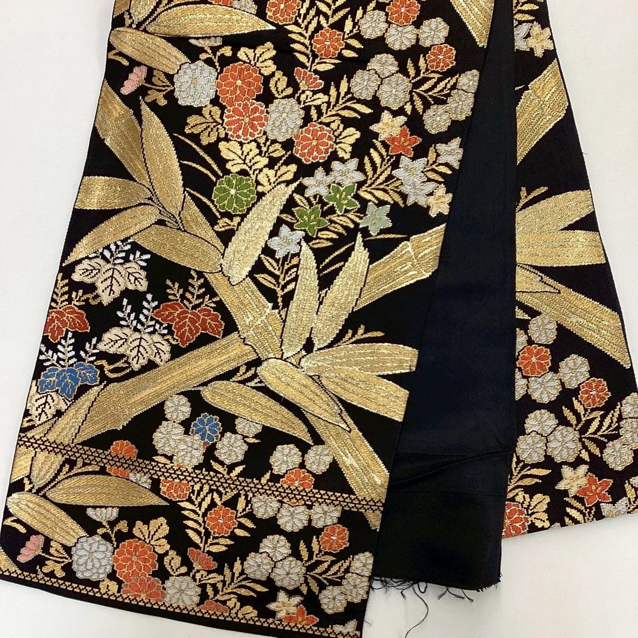 This is a pouch obi with a bamboo grass and flower design and gold thread.