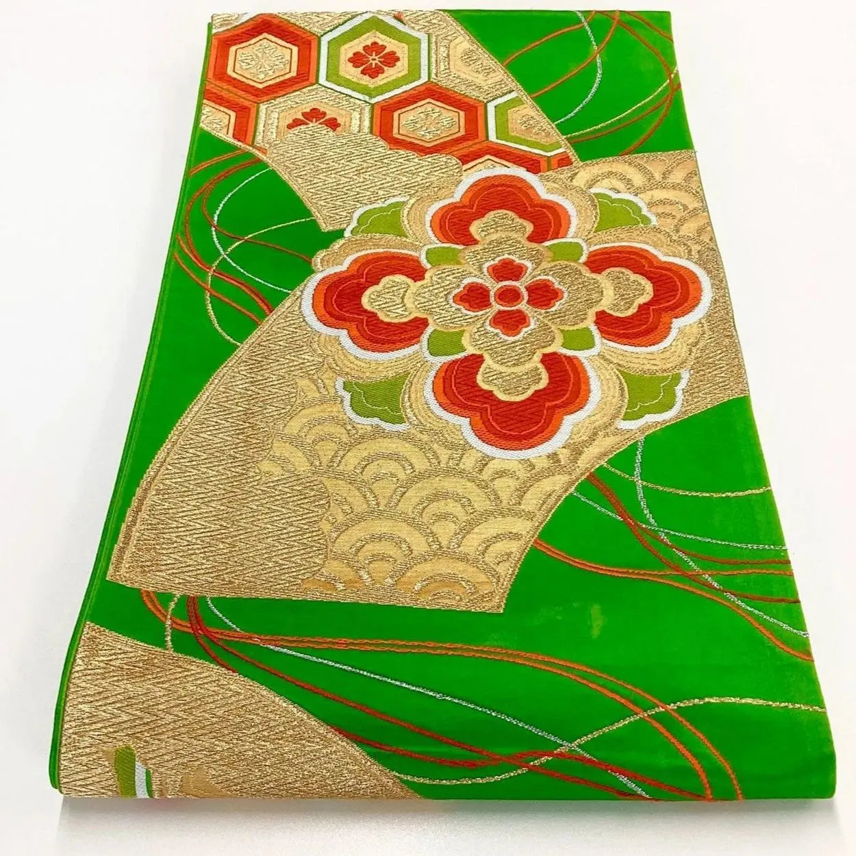 7038# Japanese Vintage Fukuro Obi Belt Kimono Fabric Silk Traditional Green