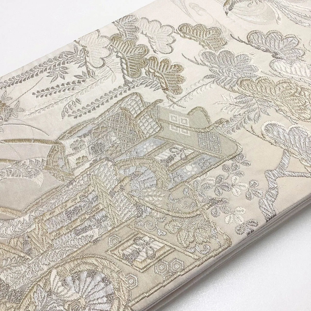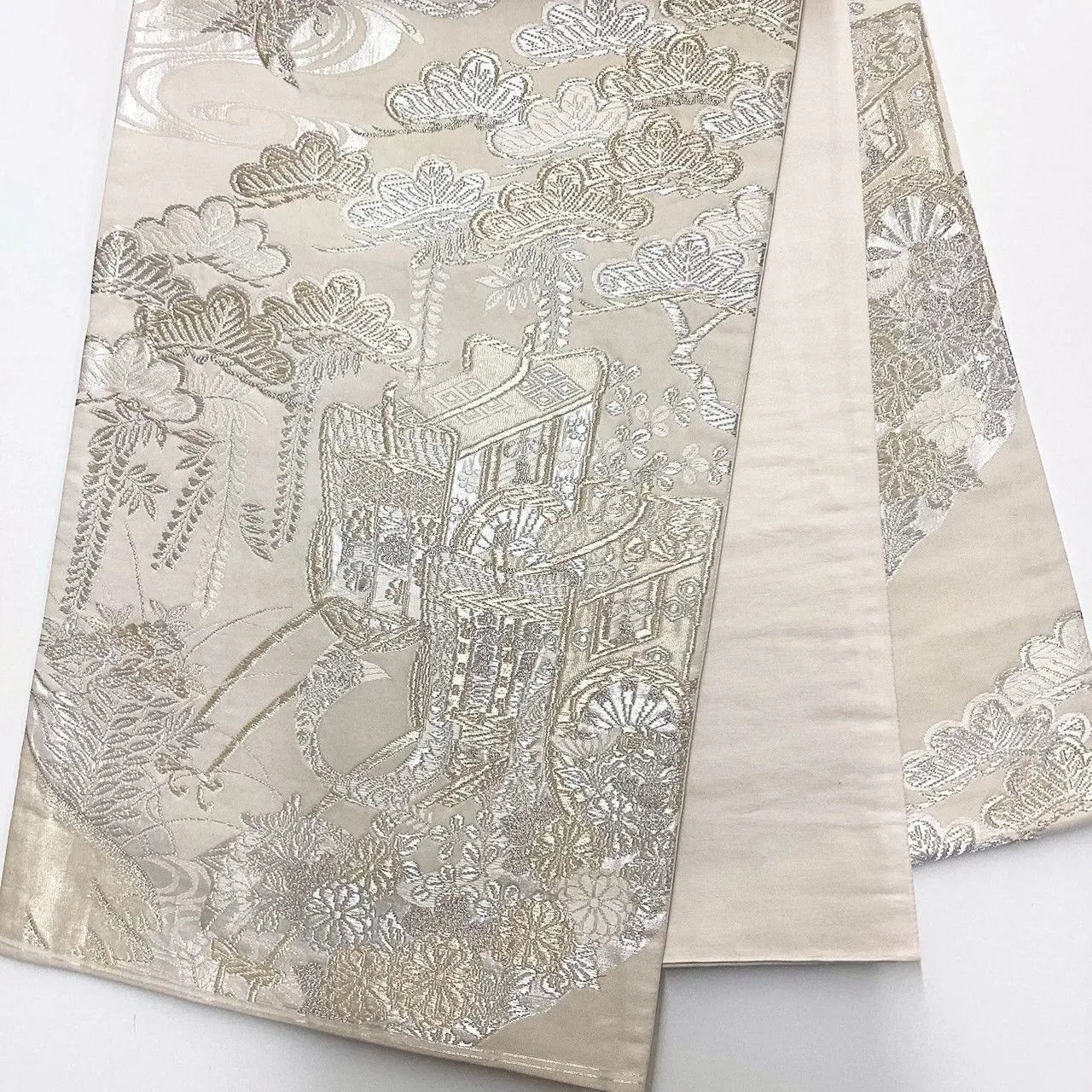 This is a bag obi featuring a pattern of carriages, flowers, and pine trees.