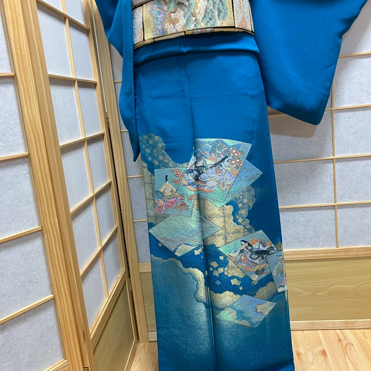 This is a color tomesode with figure design and gold threads.