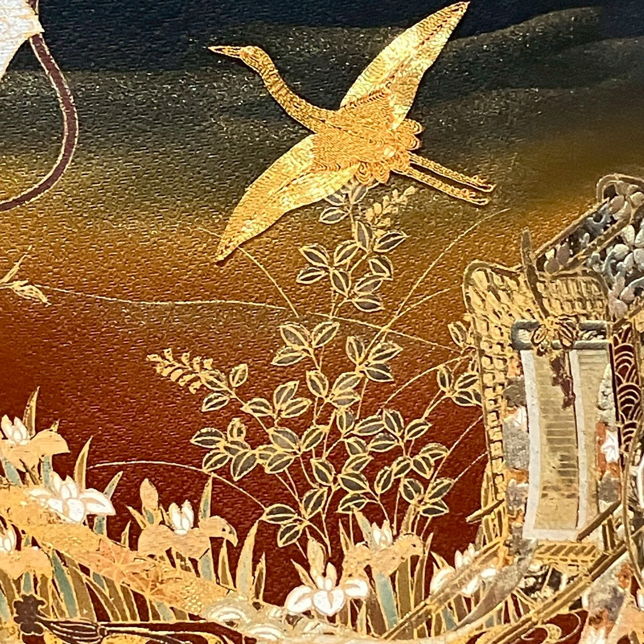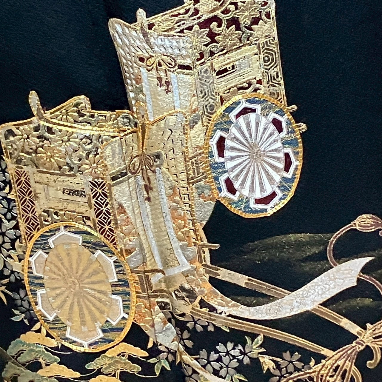 This is a black tomesode with car and crane design and embroidery.