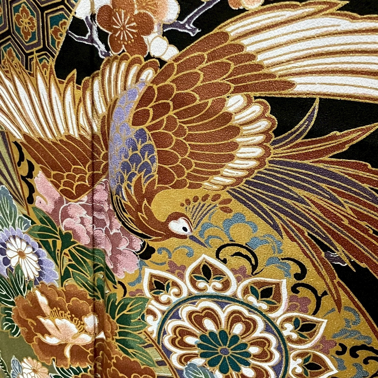 This is a black tomesode with phoenix design and gold color.
