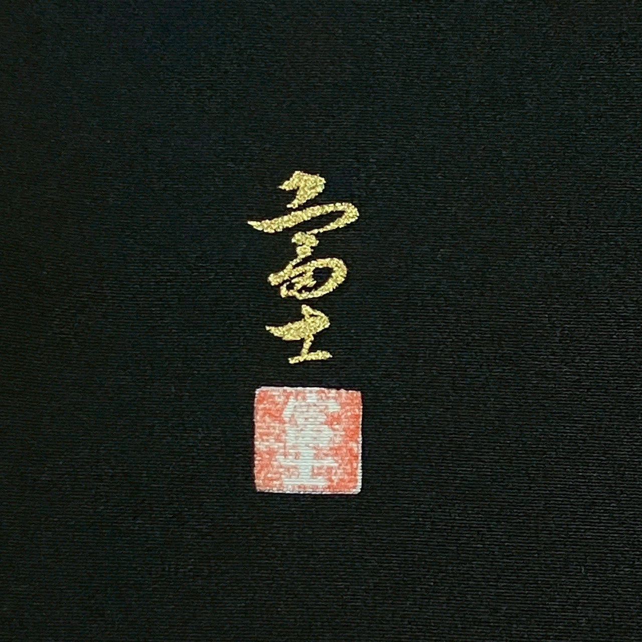 This is an artist's black tomesode with car and flower design, gold and silver coloring.