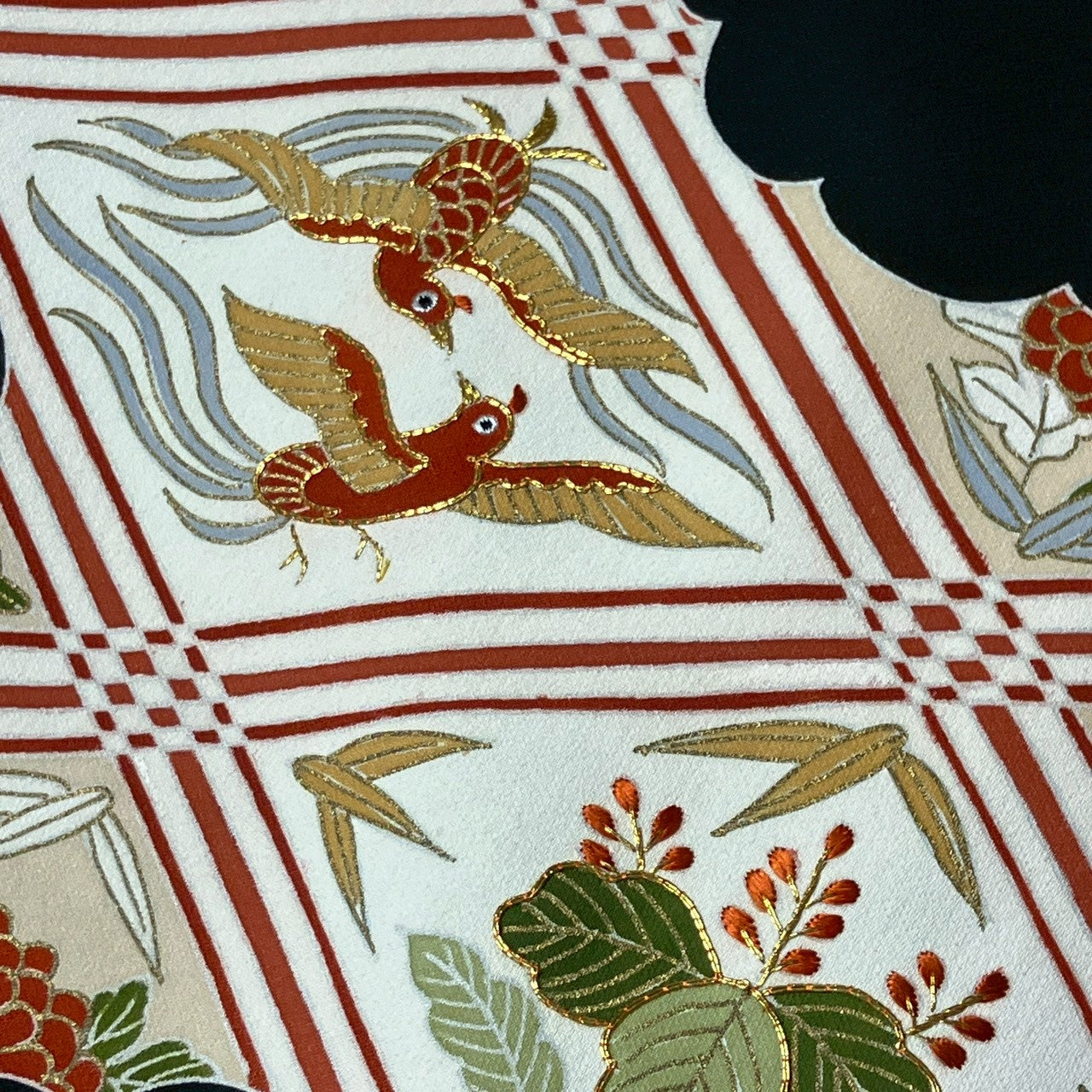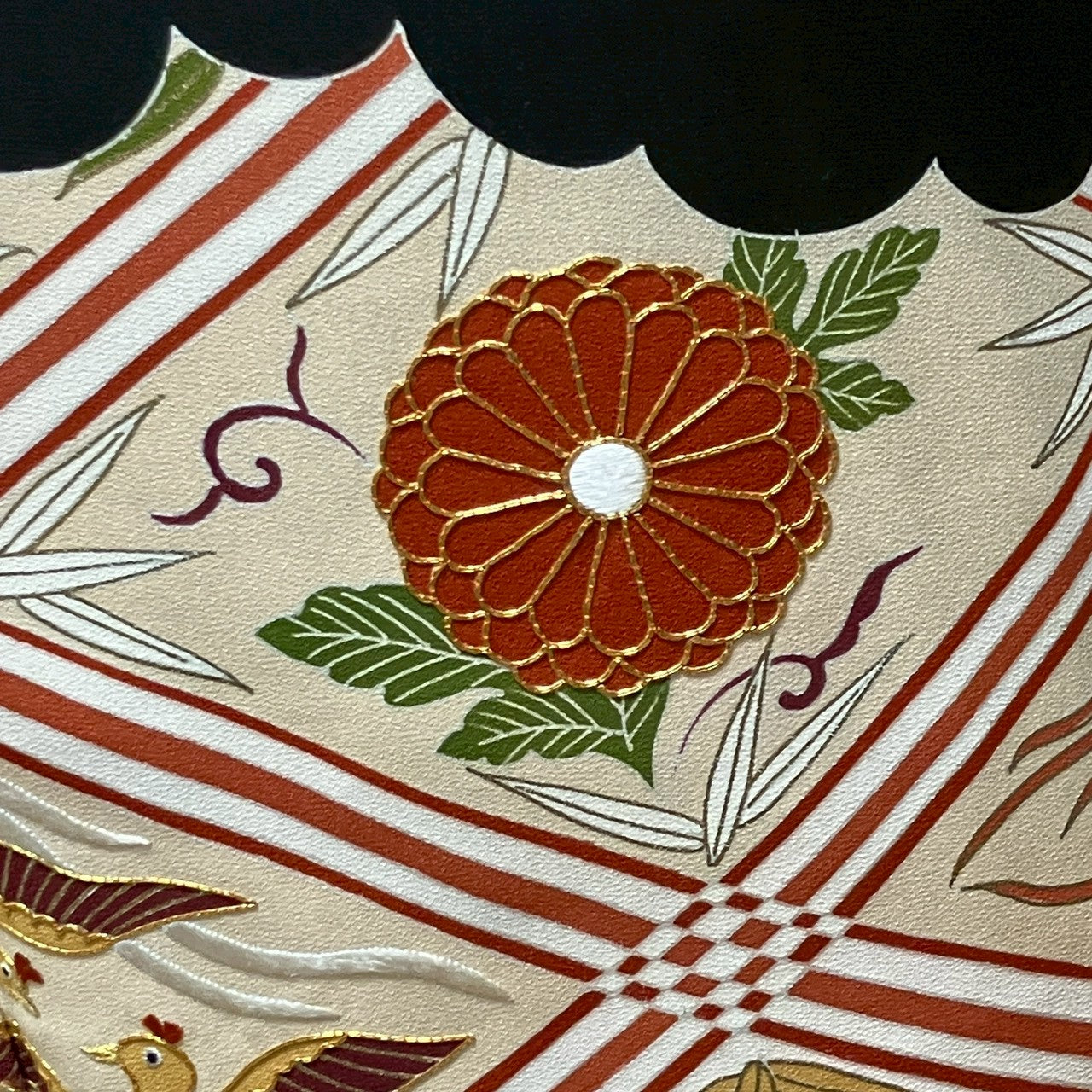 This is a visiting gown with a phoenix and flower design, embroidery, and gold.