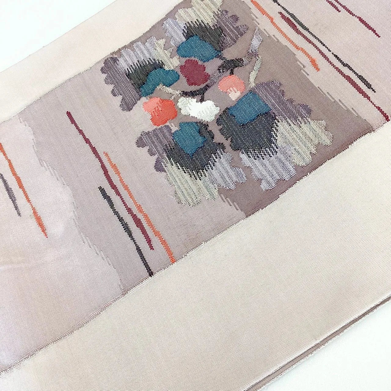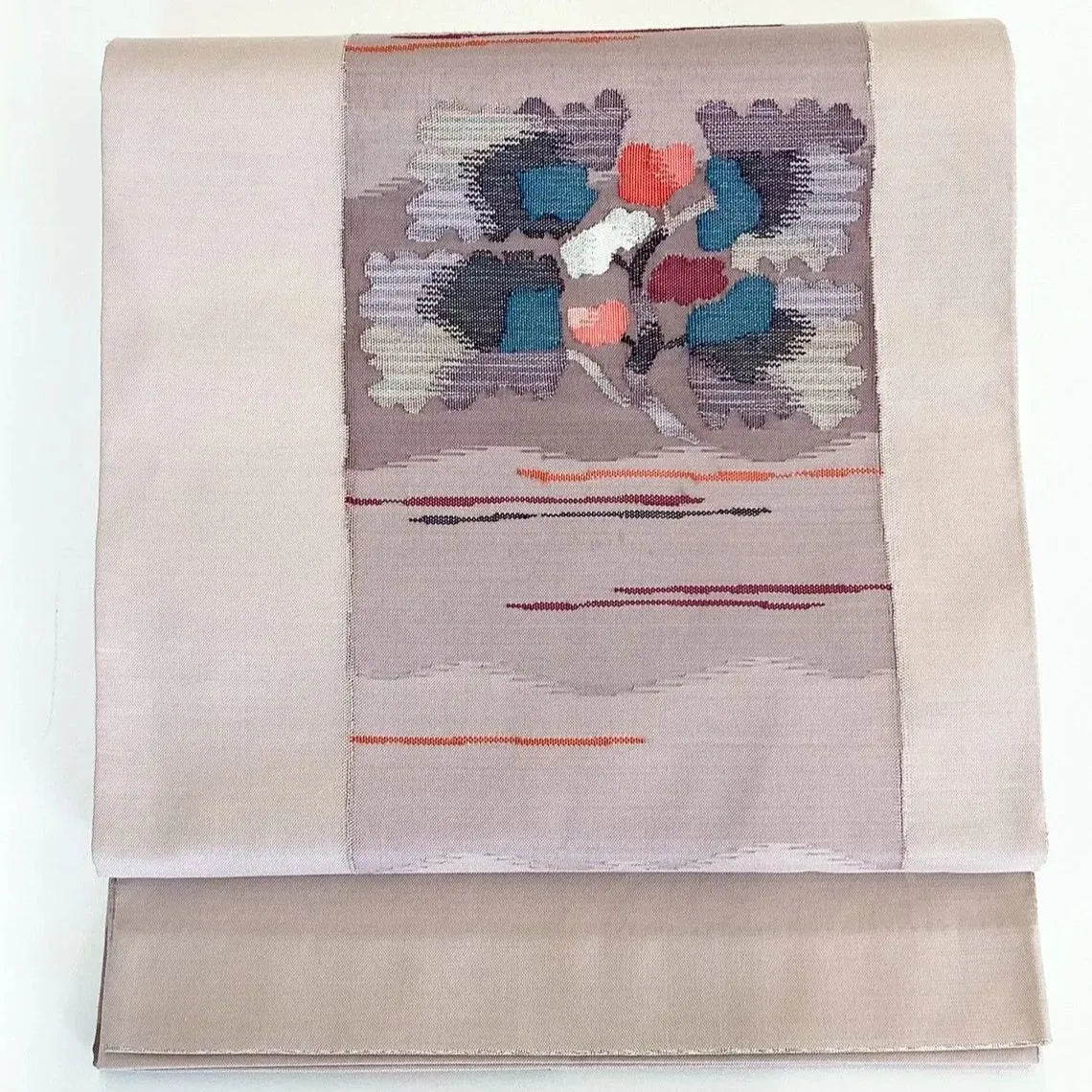 A bag obi featuring a floral pattern on a tsumugi silk ground.
